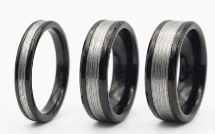 Silver fishing Line Black Ceramic ring inlaid with Genuine Silver fishing Line Wedding Band 4 mm, 6 mm or 8 mm wide ring.