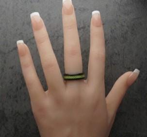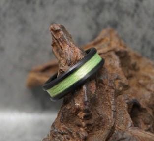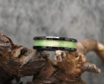 This genuine Black Ceramic ring inlaid with 100% Genuine Lime Green fishing Line - UV Glow fishing Line ring.