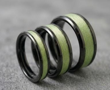 Lime Green fishing Line Black Ceramic ring inlaid with Genuine fishing Line - UV Glow Ring 4 mm, 6 mm or 8 mm wide ring.
