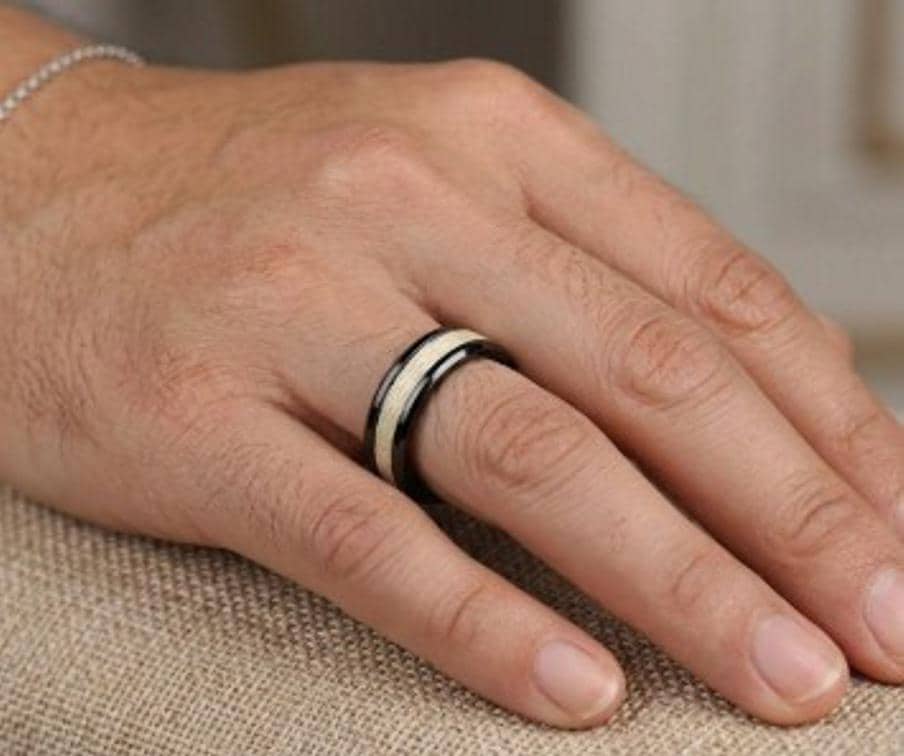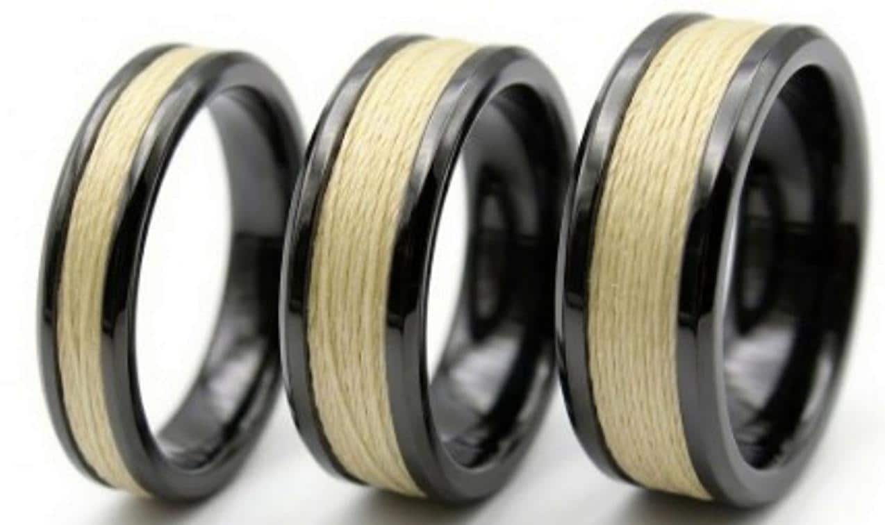 Kevlar Yellow Braided Line Inlaid Black Ceramic ring, Genuine Kevlar Line - Rings available 4 mm, 6 mm or 8 mm wide ring.