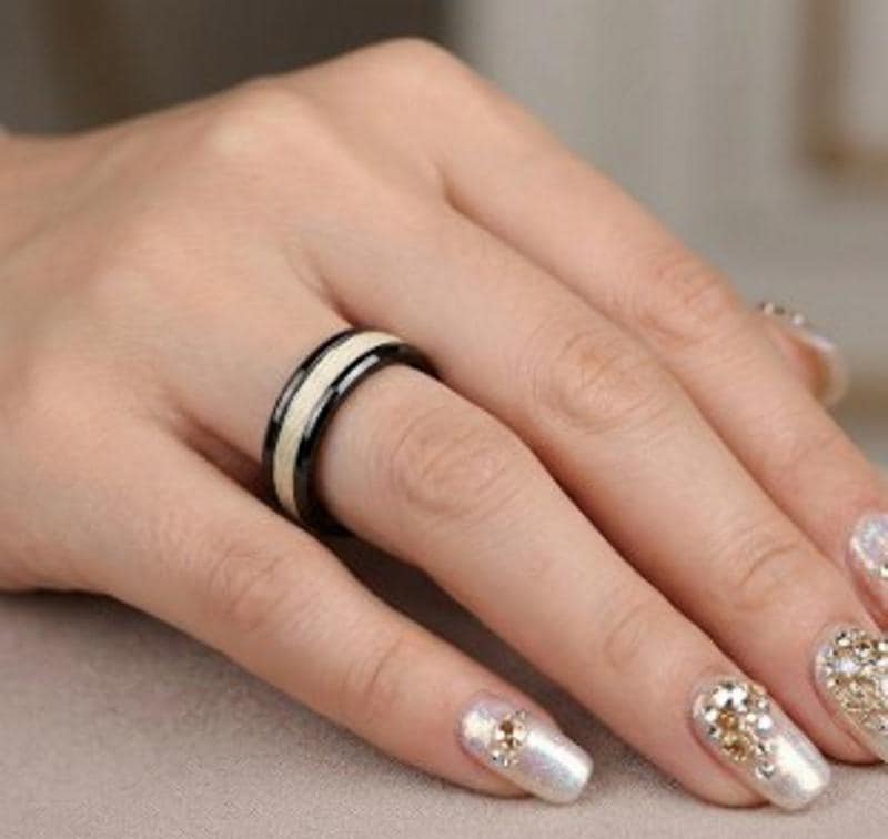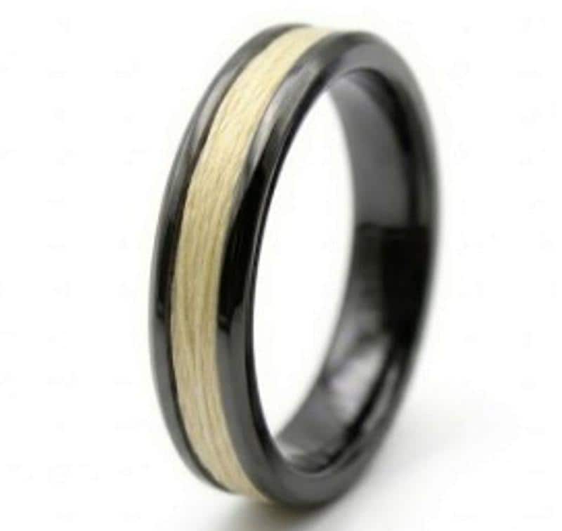 This genuine Black Ceramic ring inlaid with 100% Genuine Kevlar Braided Line: Yellow.
