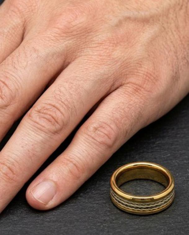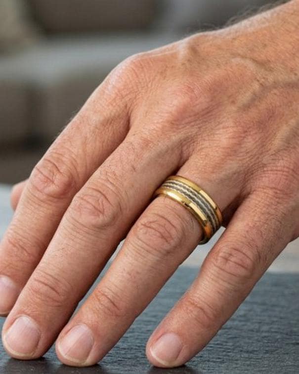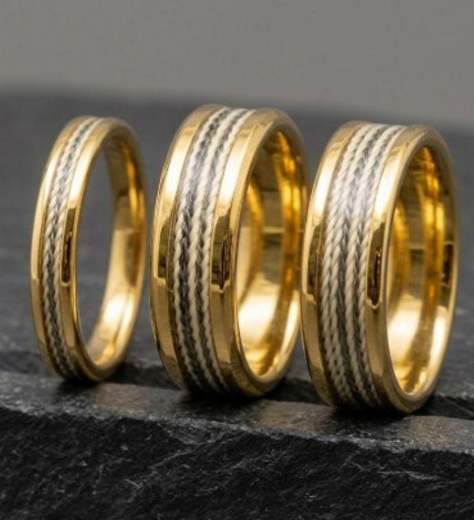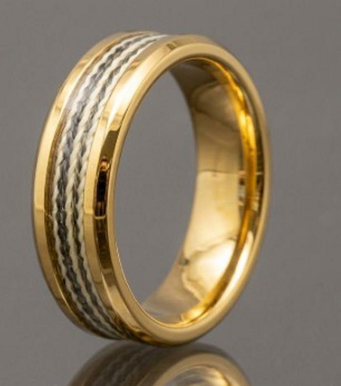 This genuine Gold Plated Tungsten ring inlaid with 100% Genuine Kevlar Braided Line: Yellow & Black.