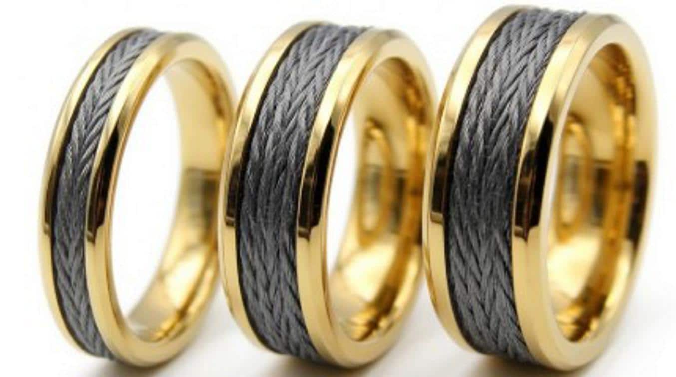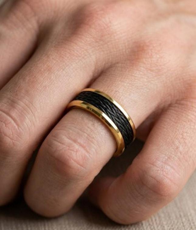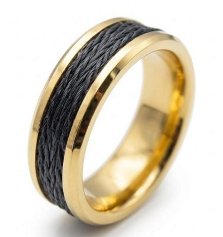 This genuine Gold Plated Tungsten ring inlaid with 100% Genuine Kevlar Braided Line: Black