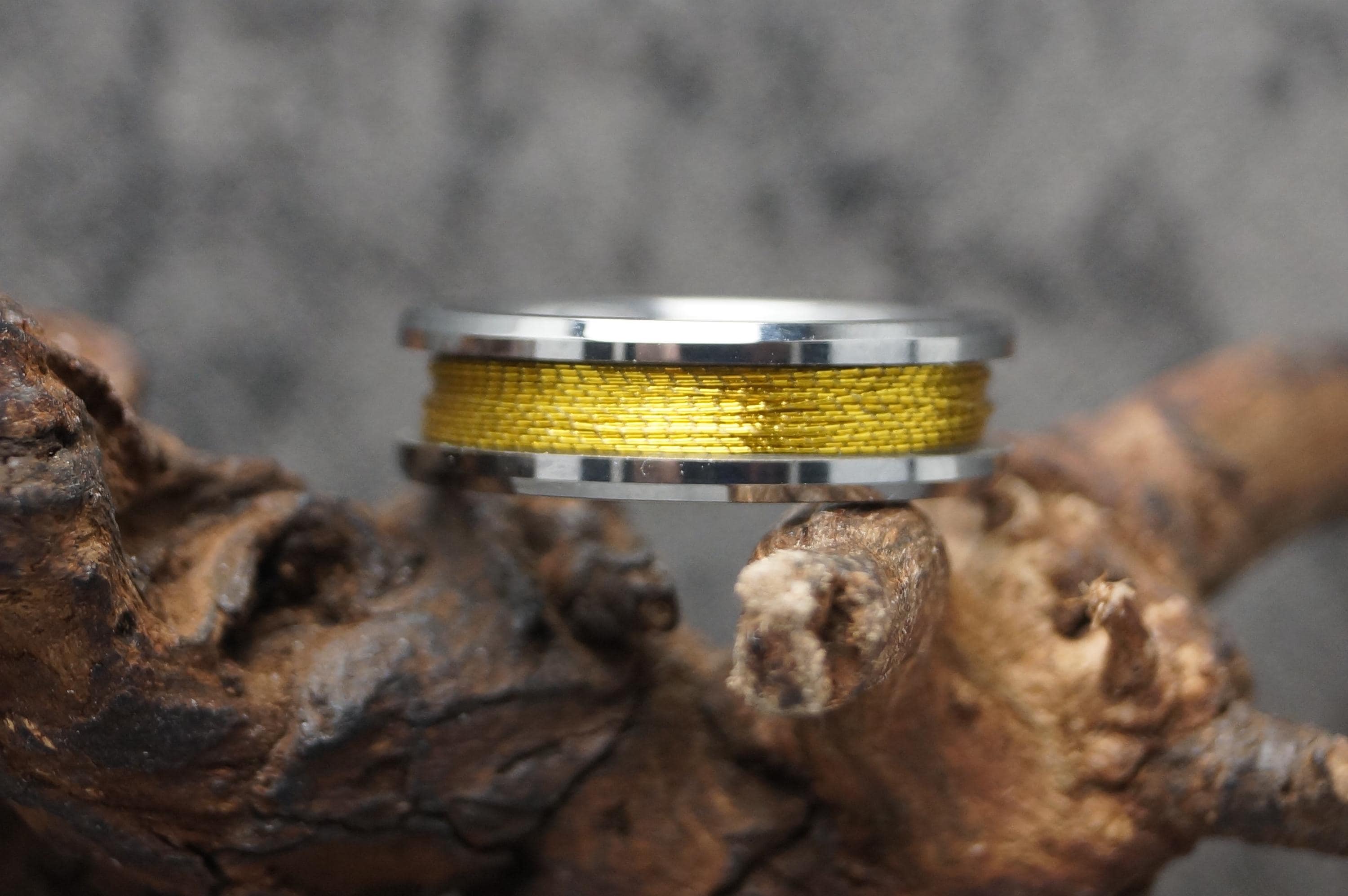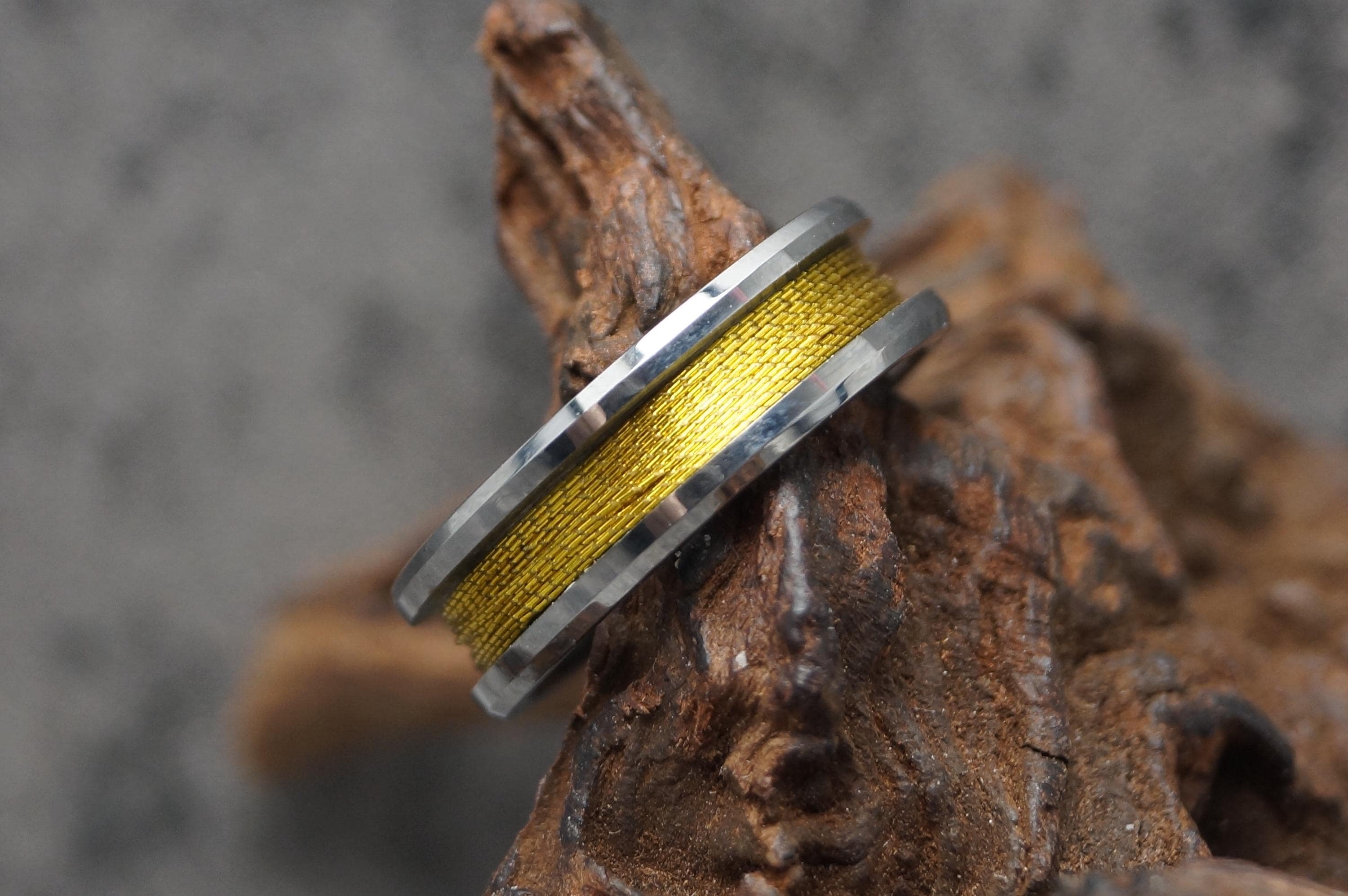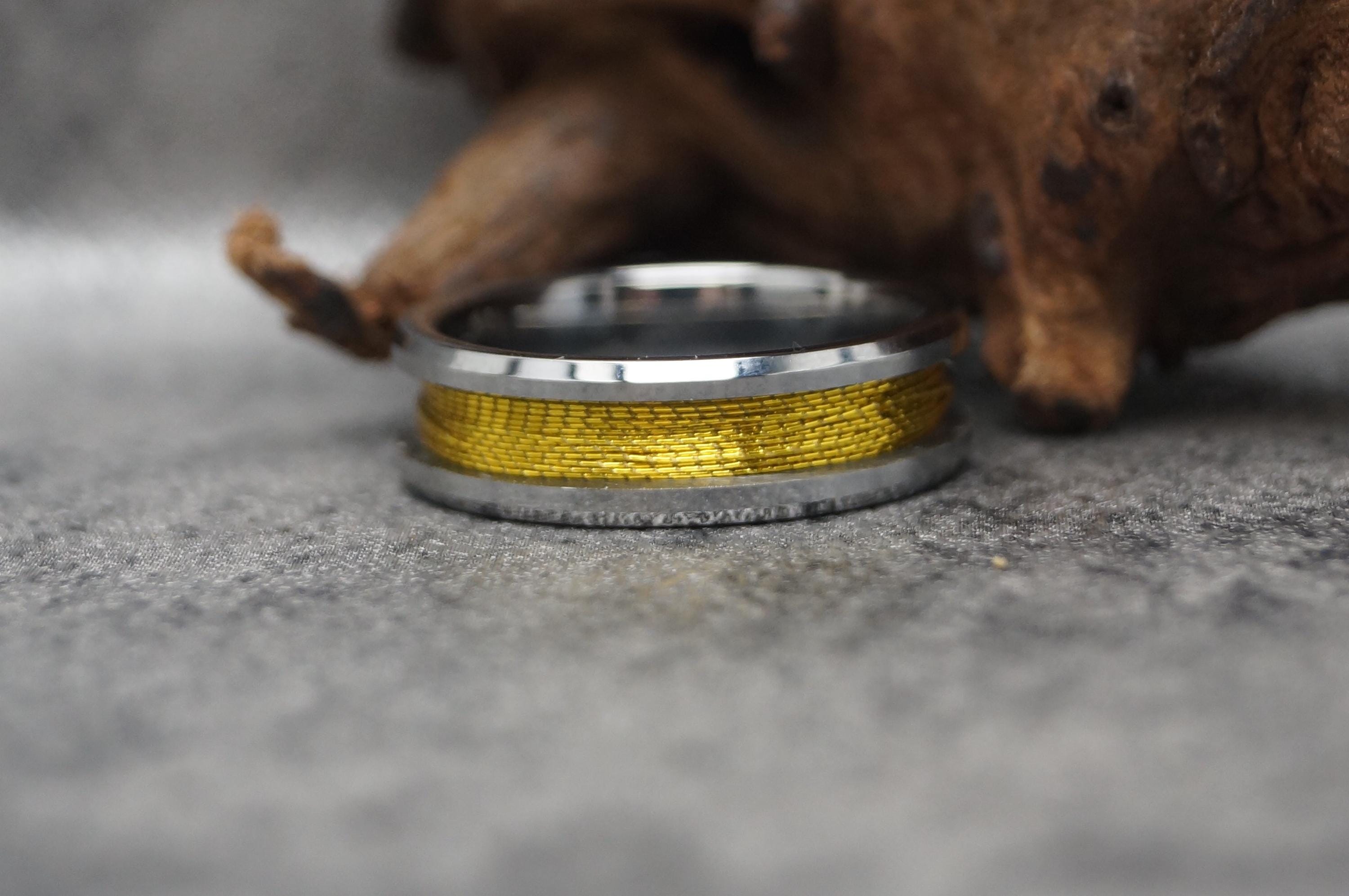 This genuine Tungsten Carbide ring is inlaid with genuine Gold fishing rod metallic thread guide ring fix line.