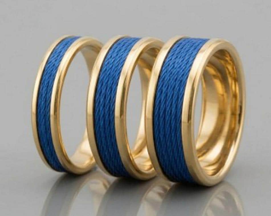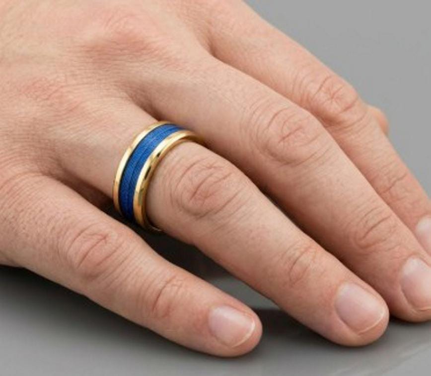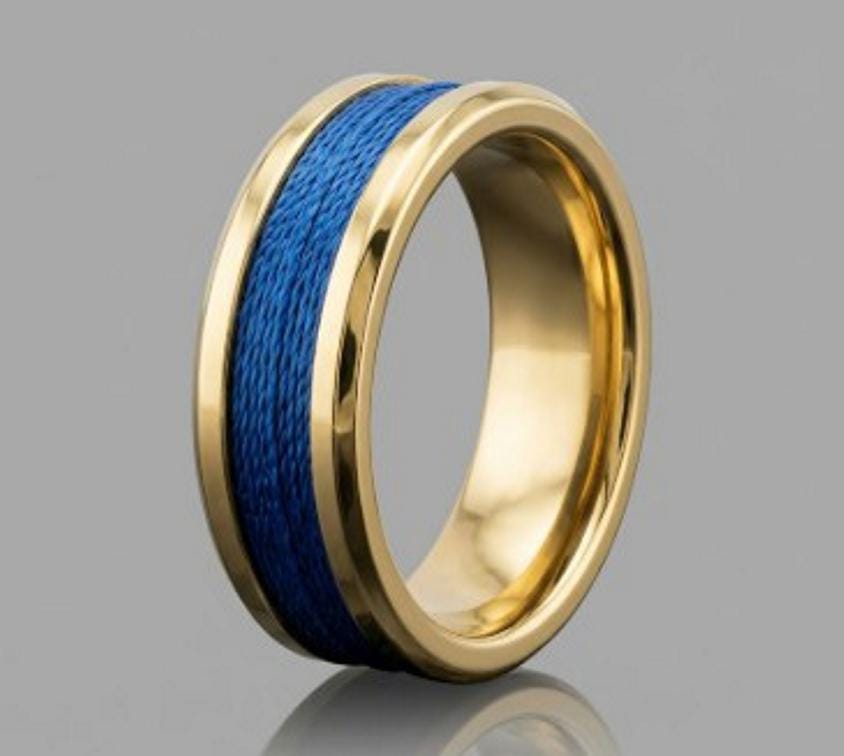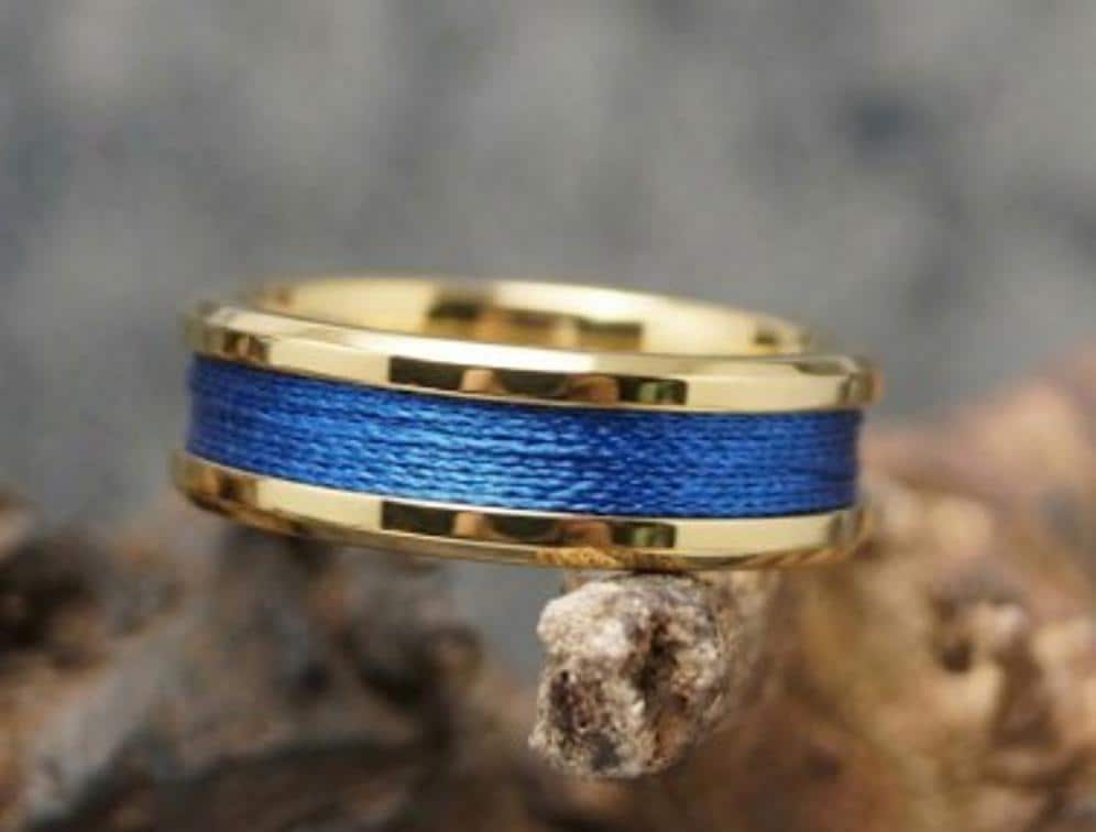 This genuine Gold Plated Tungsten Carbide ring is inlaid with genuine Blue fishing rod metallic thread guide ring fix line.