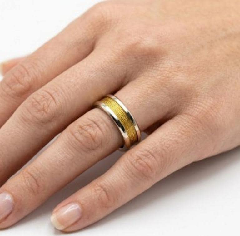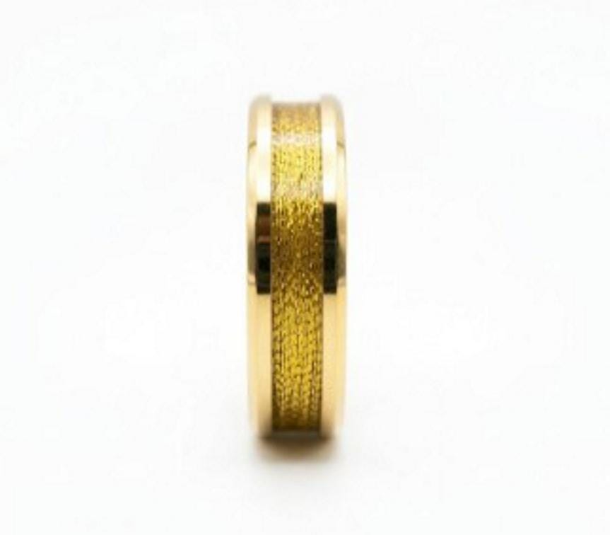 This genuine Gold Plated Tungsten Carbide ring inlaid with genuine Gold Shiny Thread.
