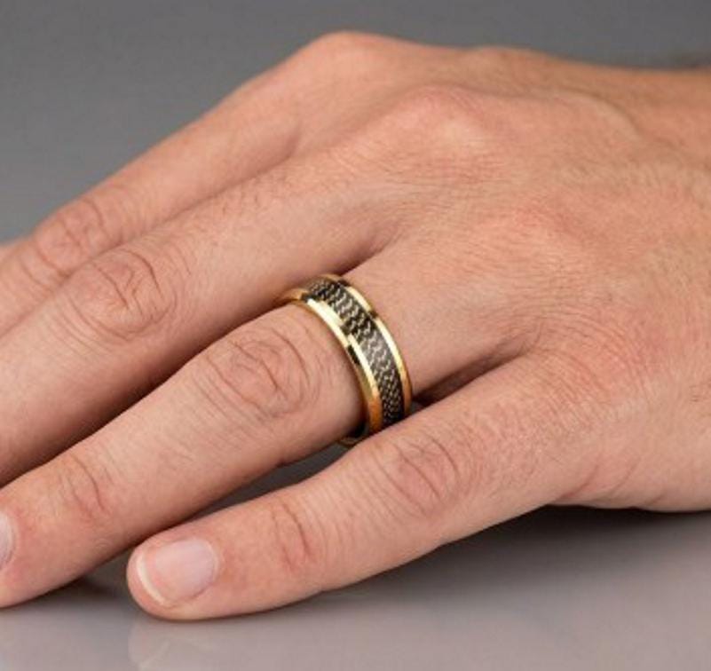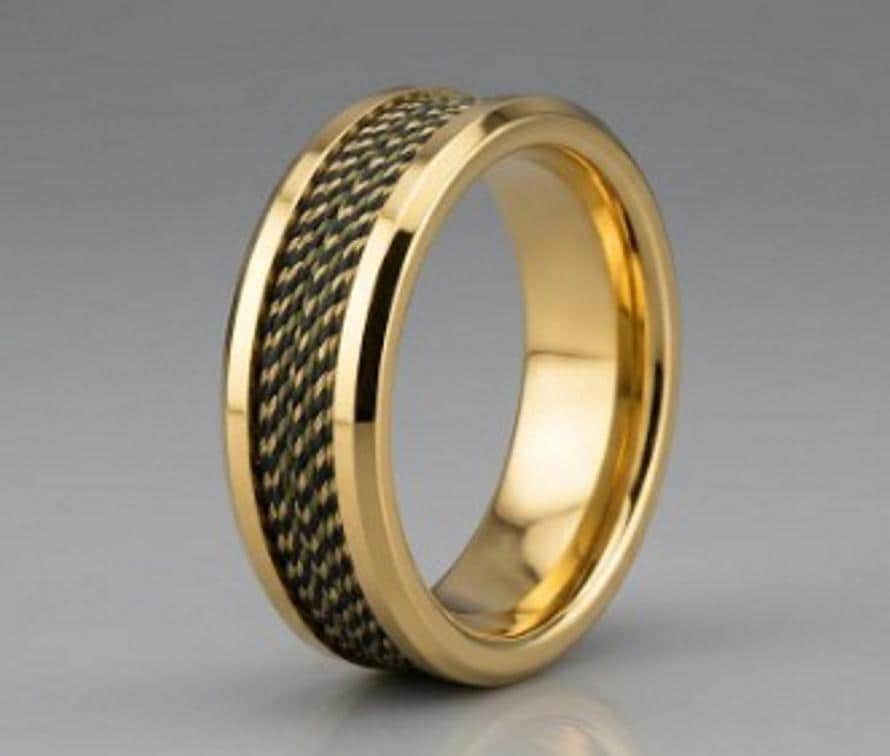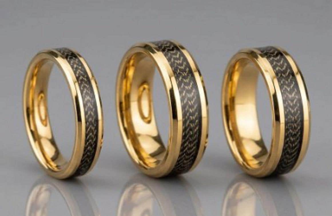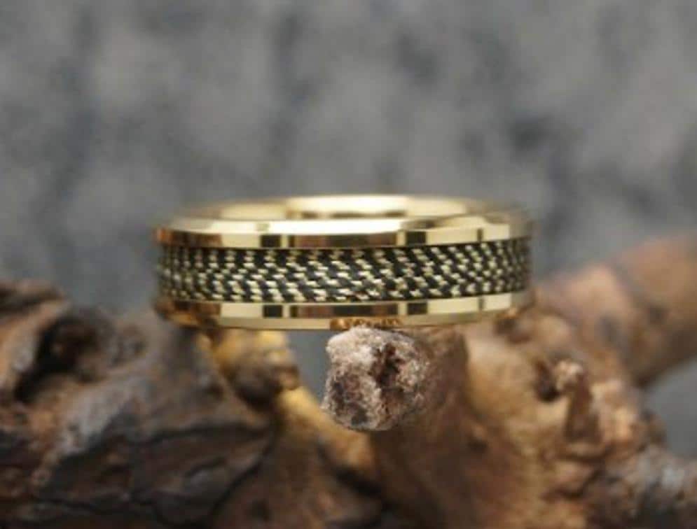This genuine Gold Plated Tungsten Carbide ring is inlaid with genuine Gold & Black fishing rod metallic thread guide ring fix line.