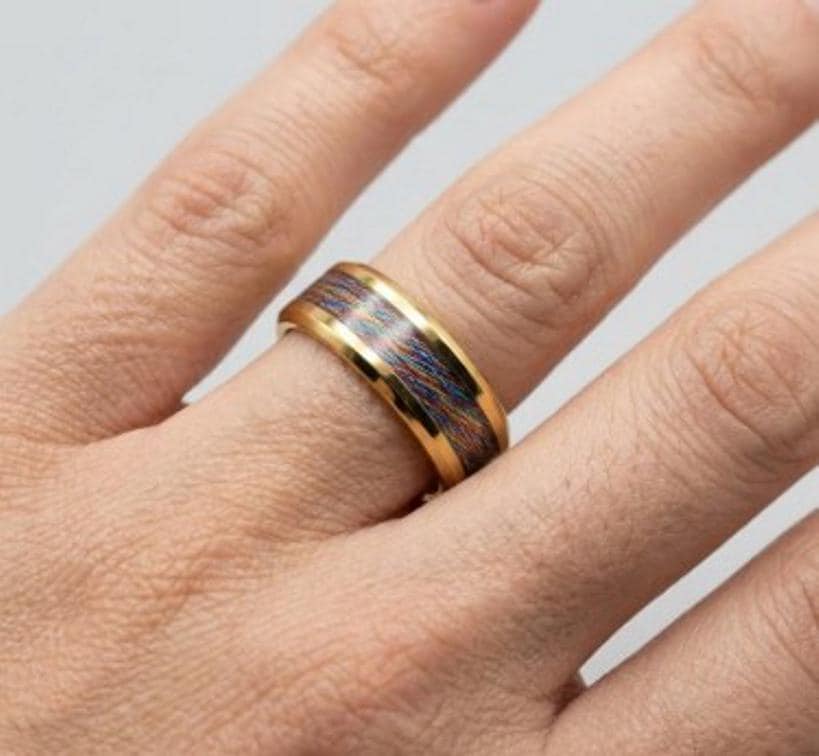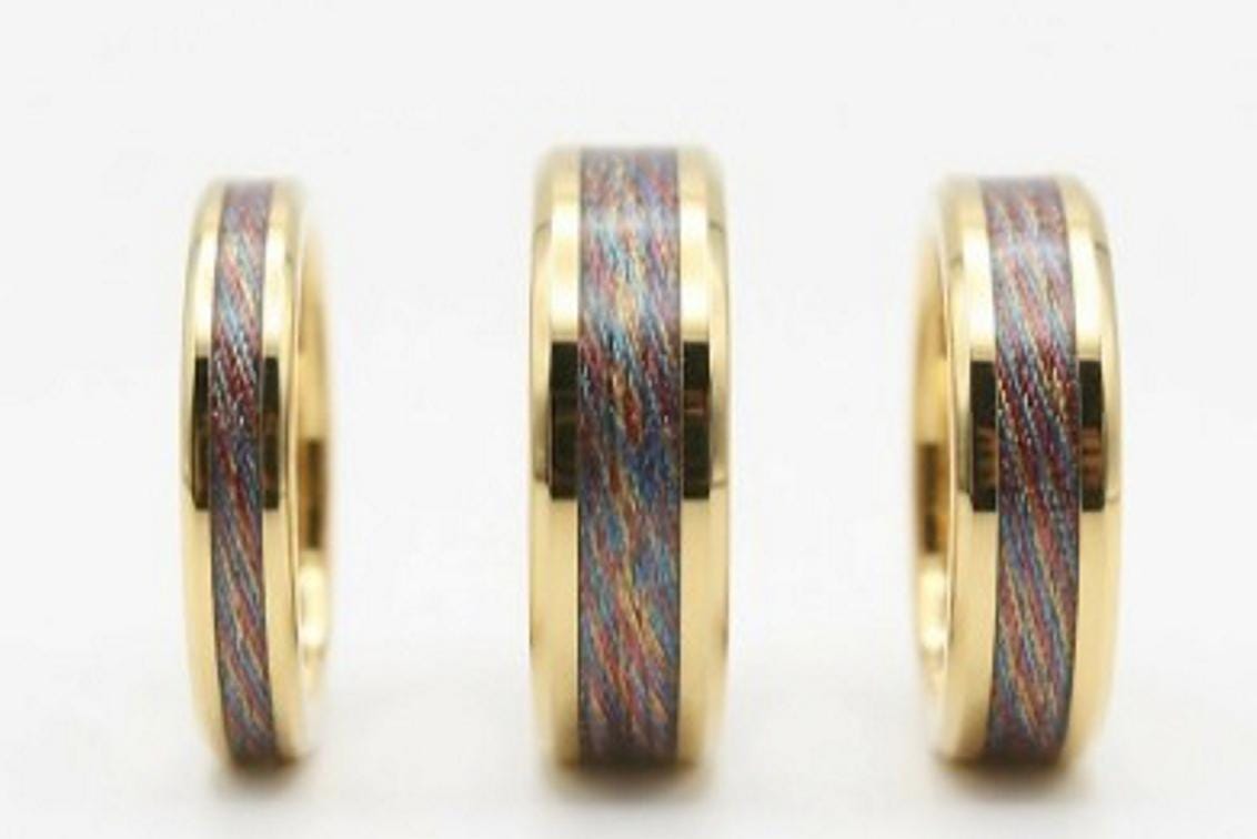 This genuine Gold Plated Tungsten Carbide ring inlaid with genuine Multi-Colour Metalic Thread.