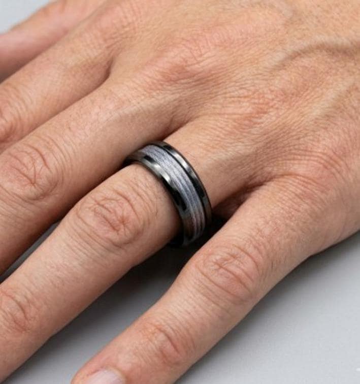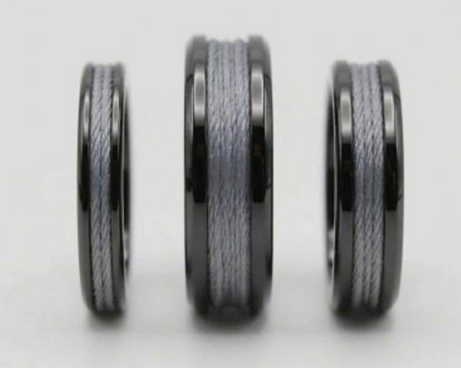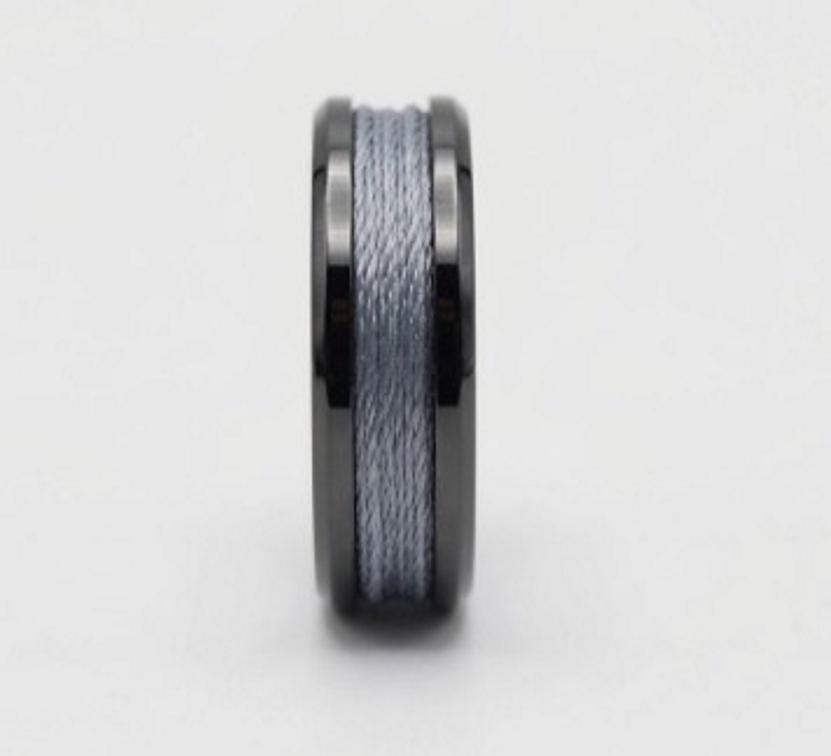 This genuine Black Ceramic ring inlaid with genuine Grey Fishing Line.