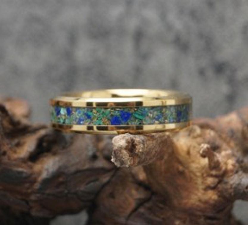 This Gold Plated genuine Tungsten Carbide ring inlaid with 100% Natural Azurite.