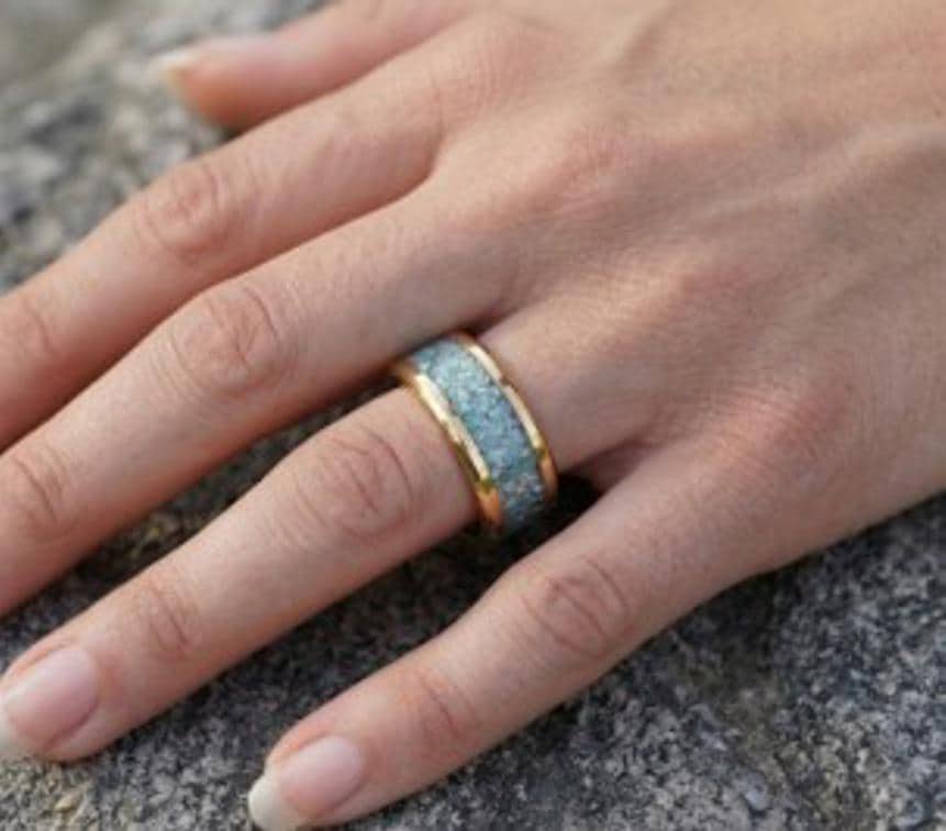 This genuine Gold Plated Tungsten Carbide ring inlaid with 100% Natural Blue Apatite.