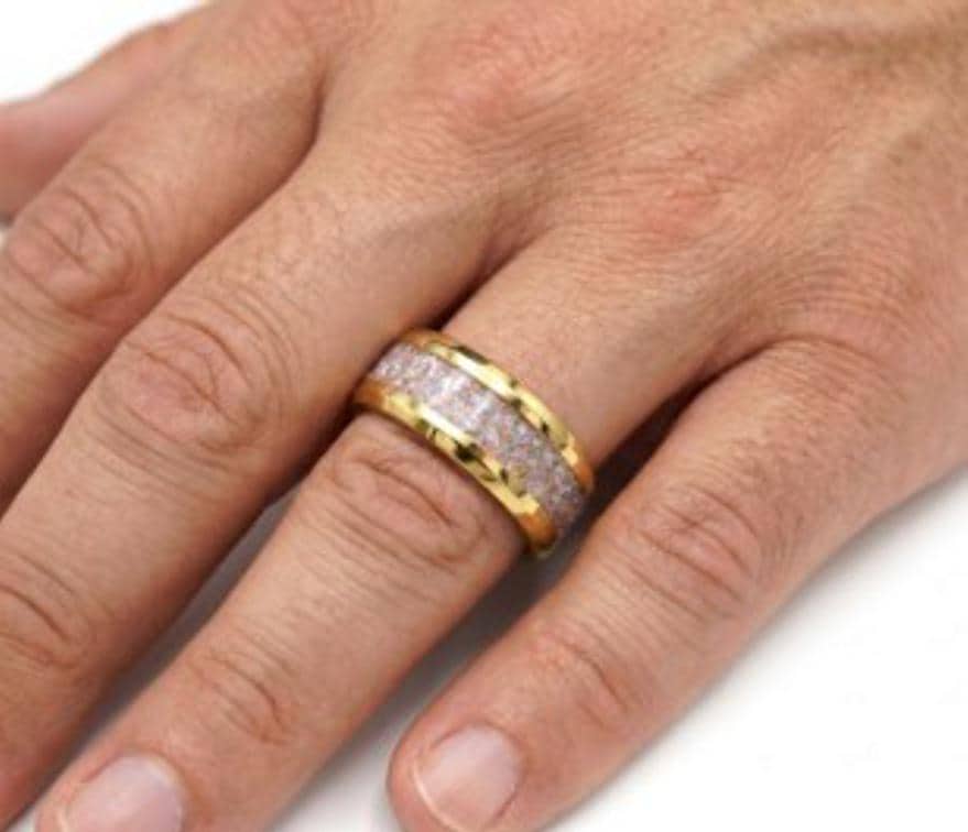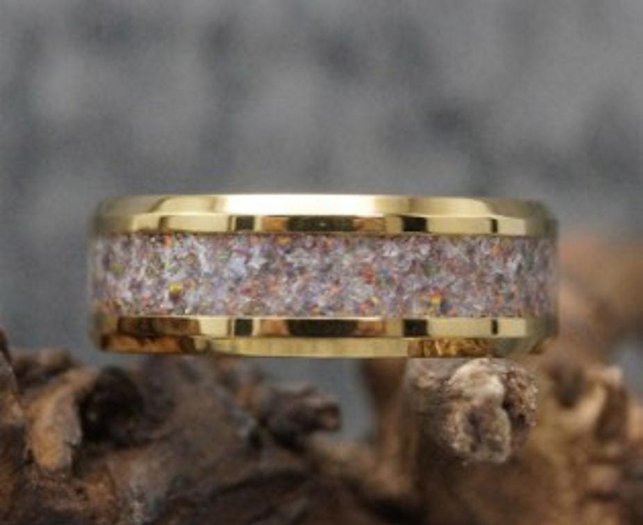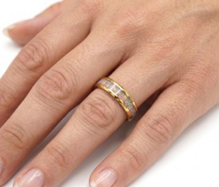 This genuine Gold Plated Tungsten Carbide ring inlaid with 100% Natural Madagascar White Opal.