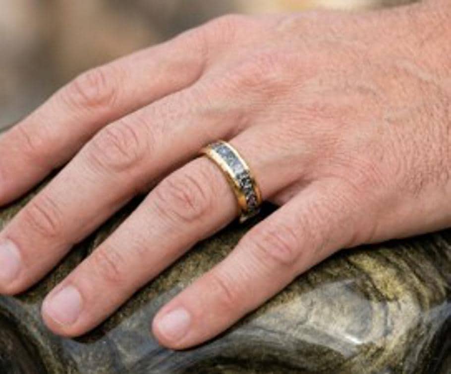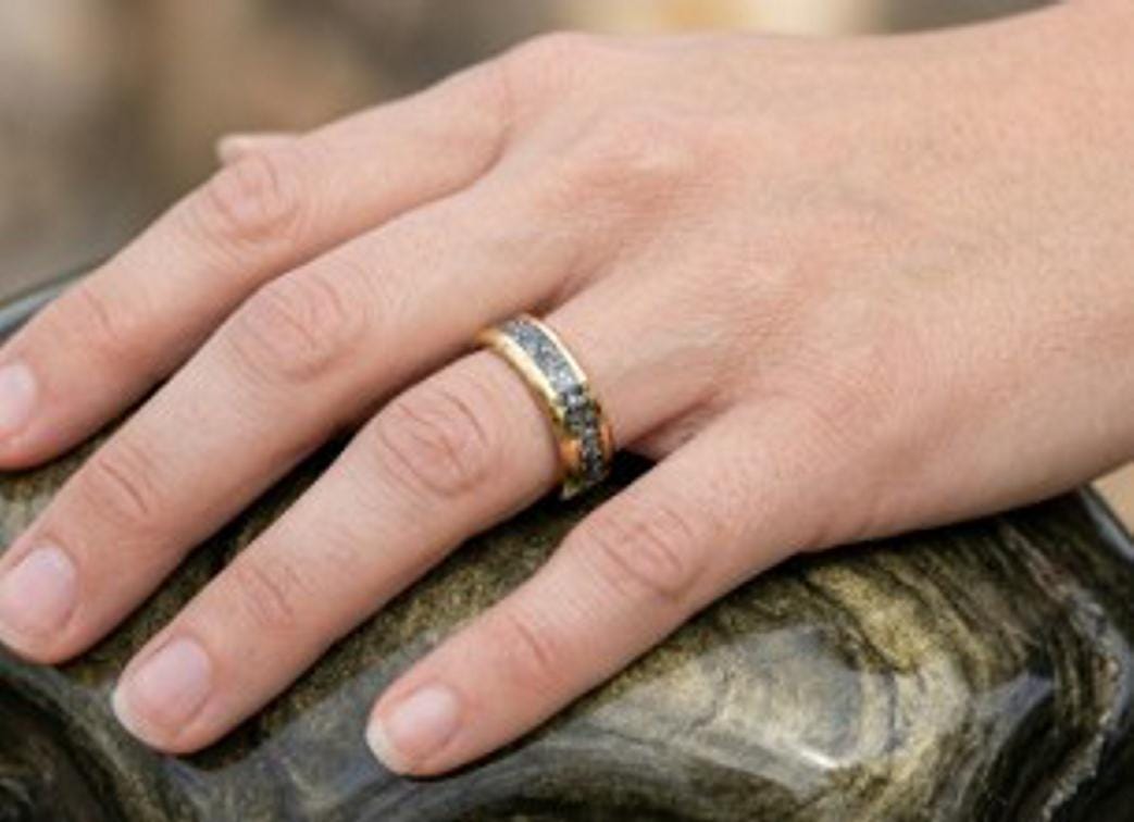 This genuine Gold Plated Tungsten Carbide ring inlaid with 100% Natural Golden Obsidian.