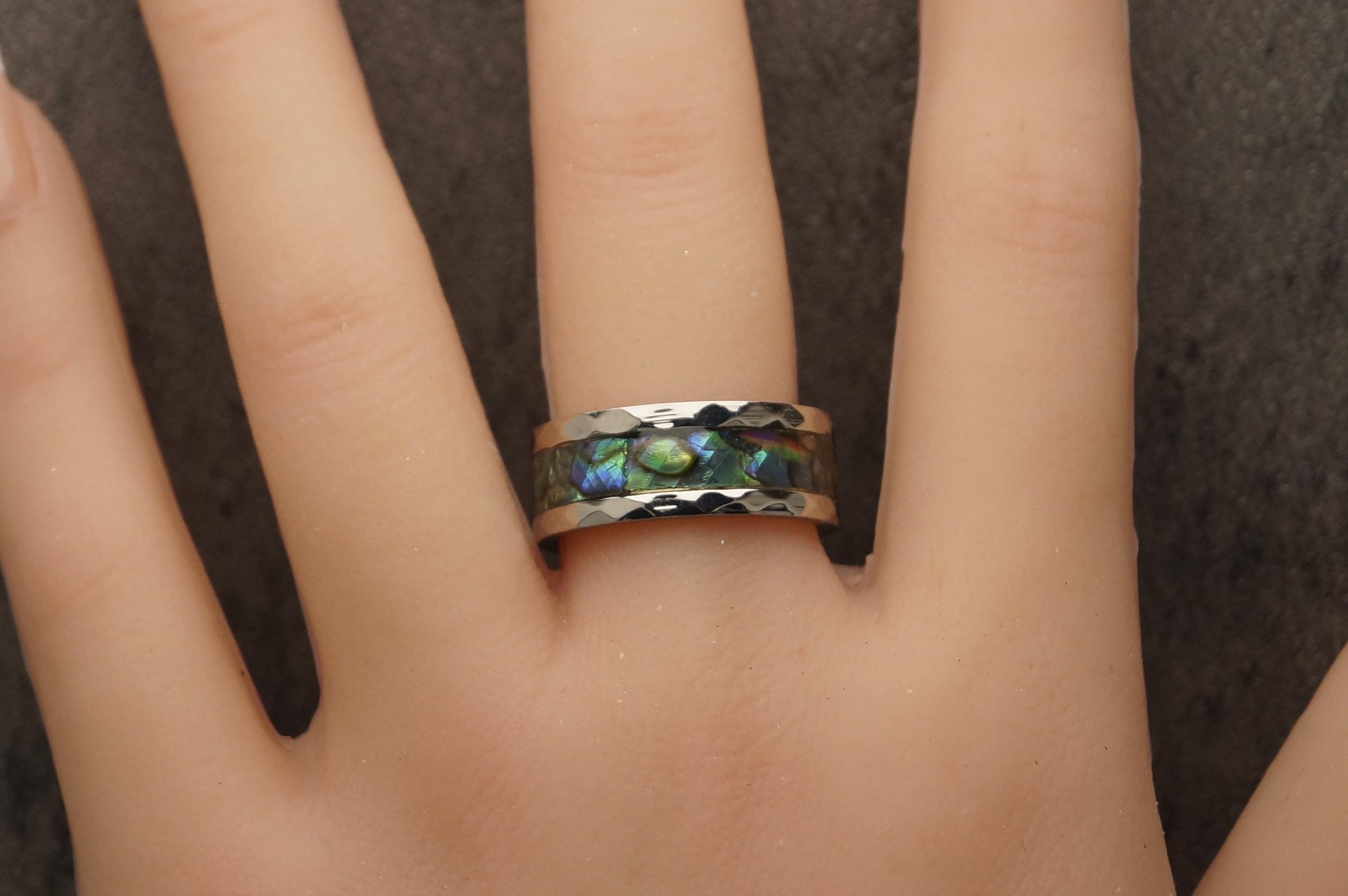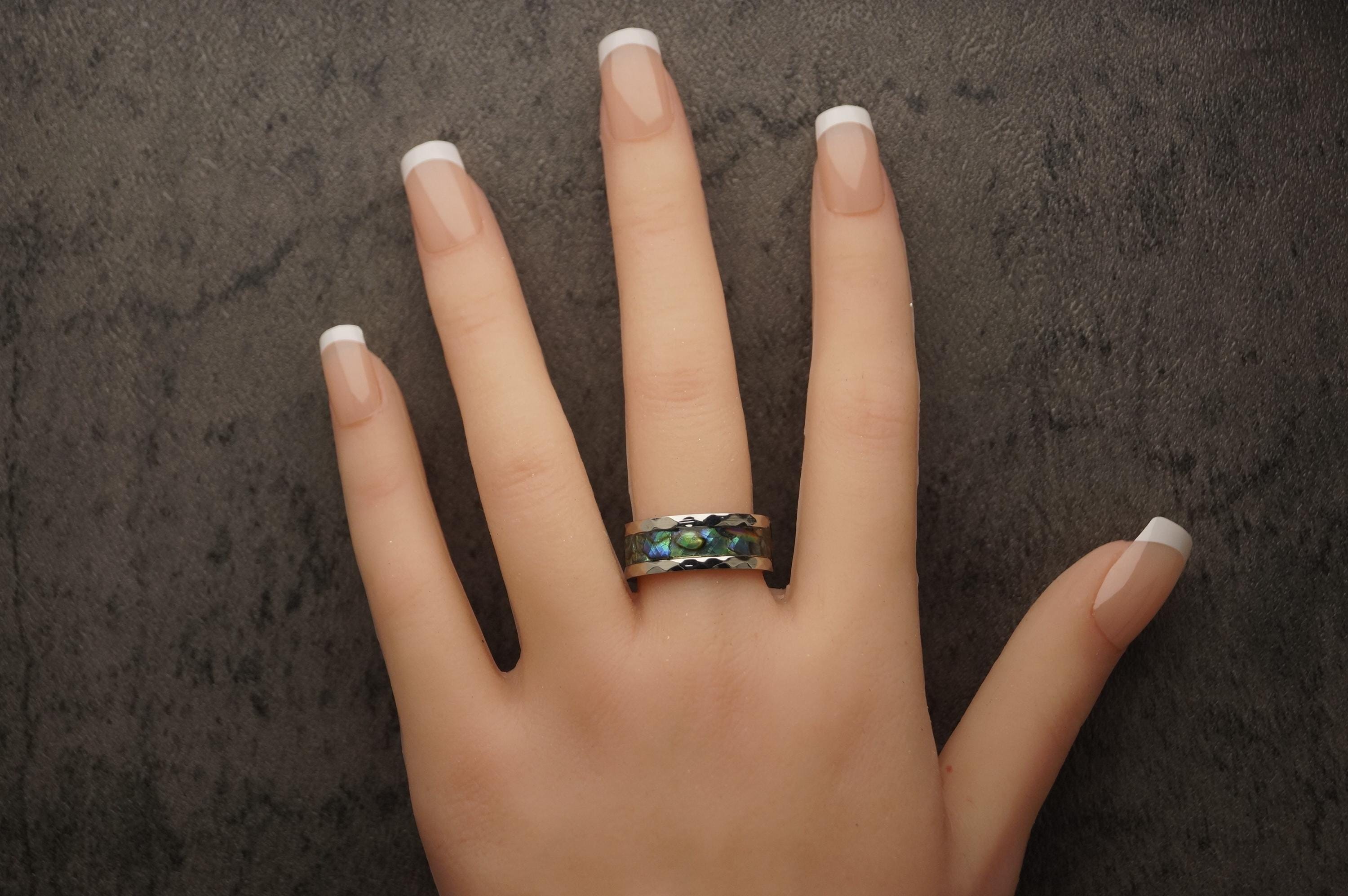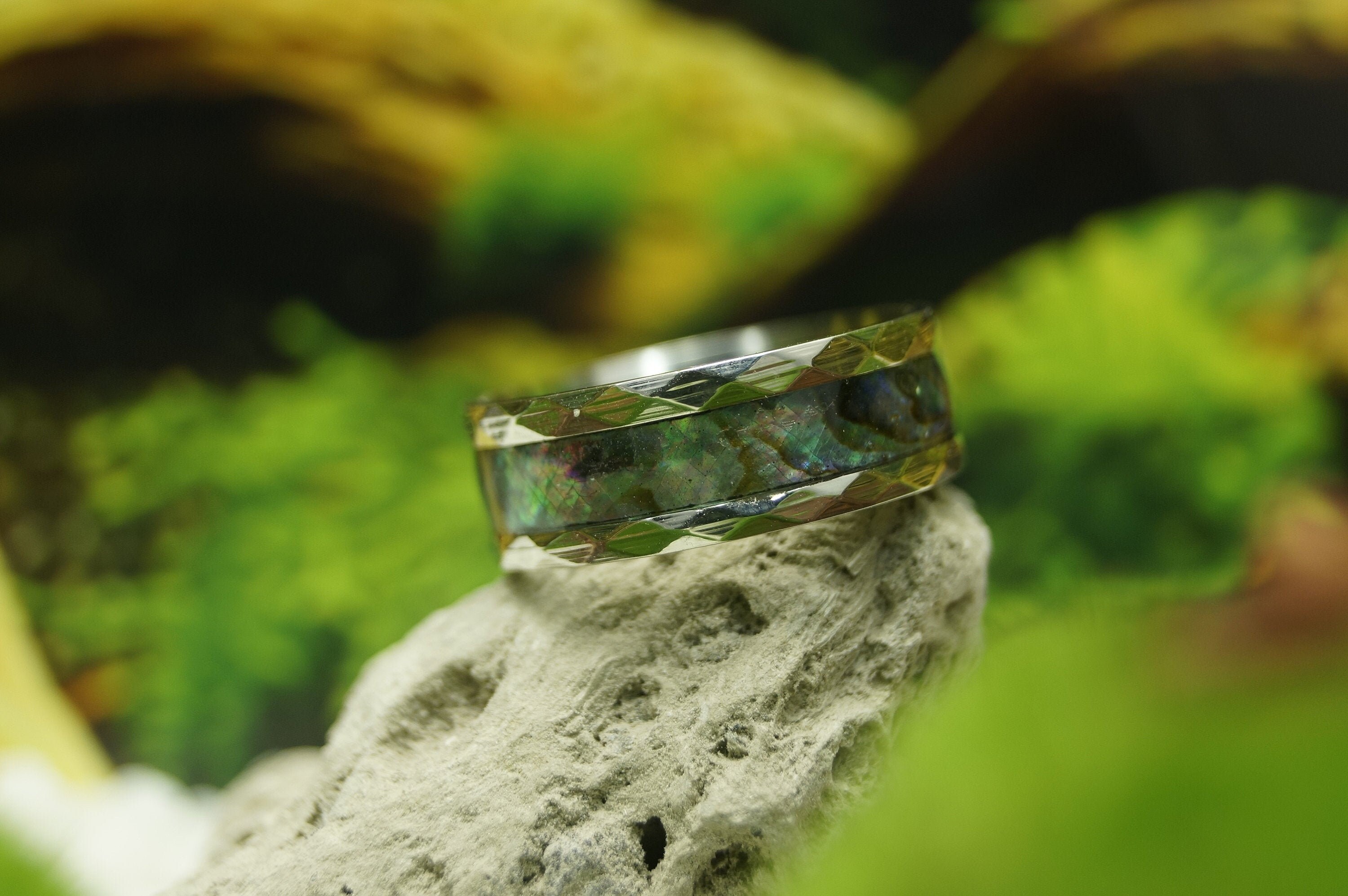 Ring Width: 8 mm / 0.314961" Every Abalone Shell Tungsten Faceted Ring is unique.