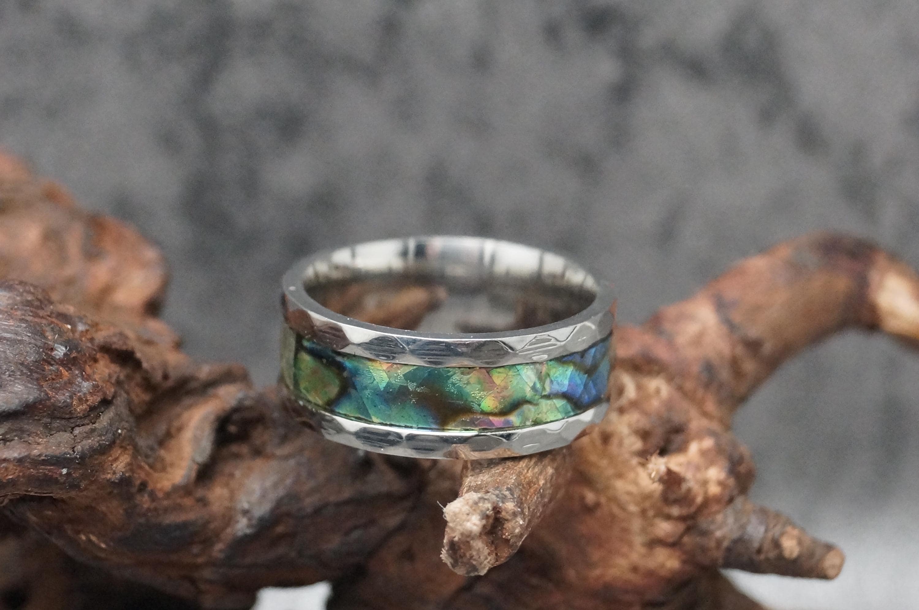 This genuine Tungsten Carbide ring inlaid with 100% Natural Abalone.