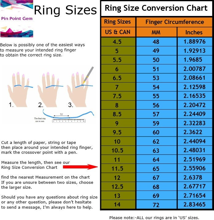 1) Please measure in mm - The circumference of your intended ring finger, see our quick measure guide for details (our last photo) - This will help to make sure that you will receive the correct size.