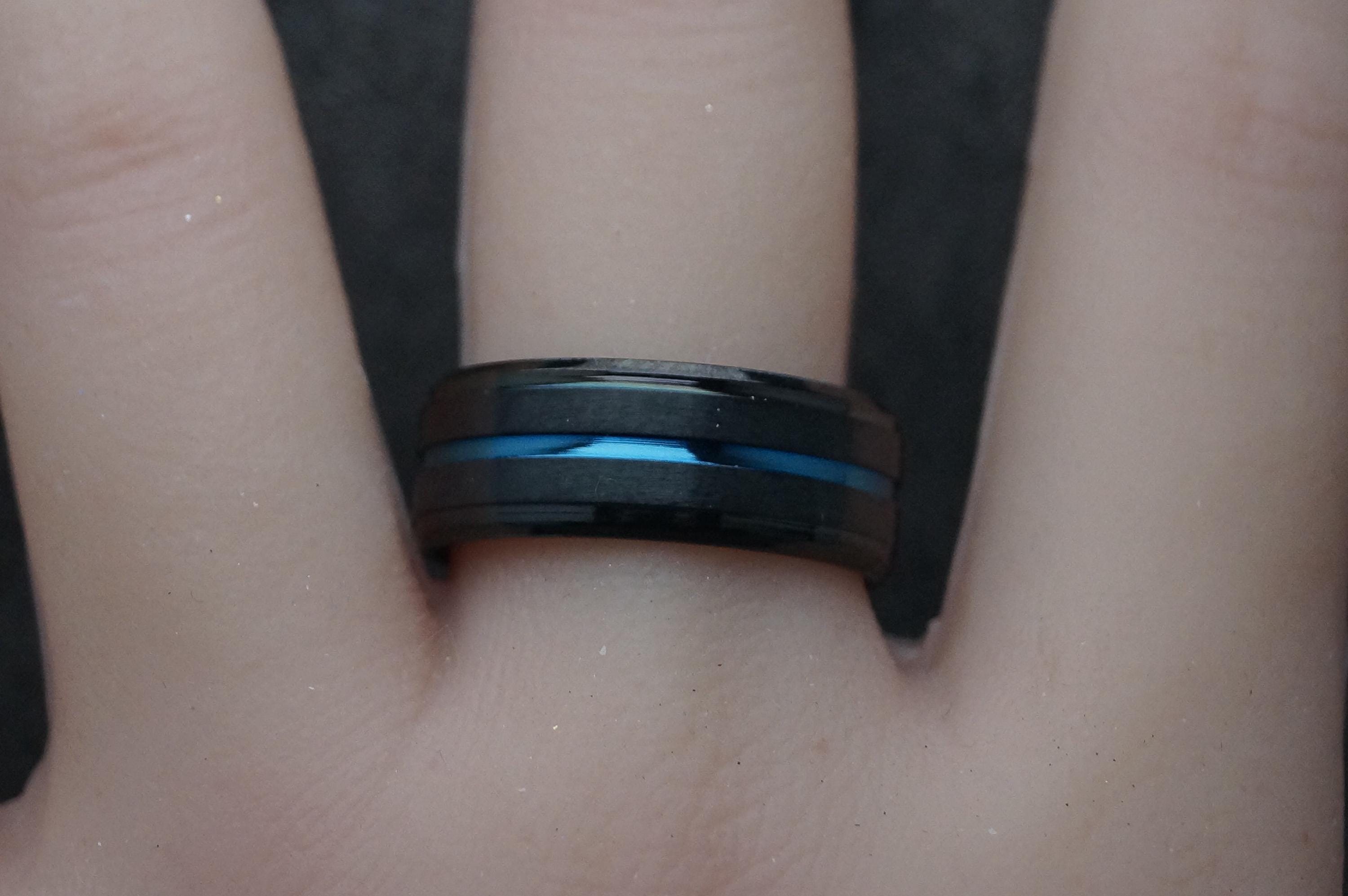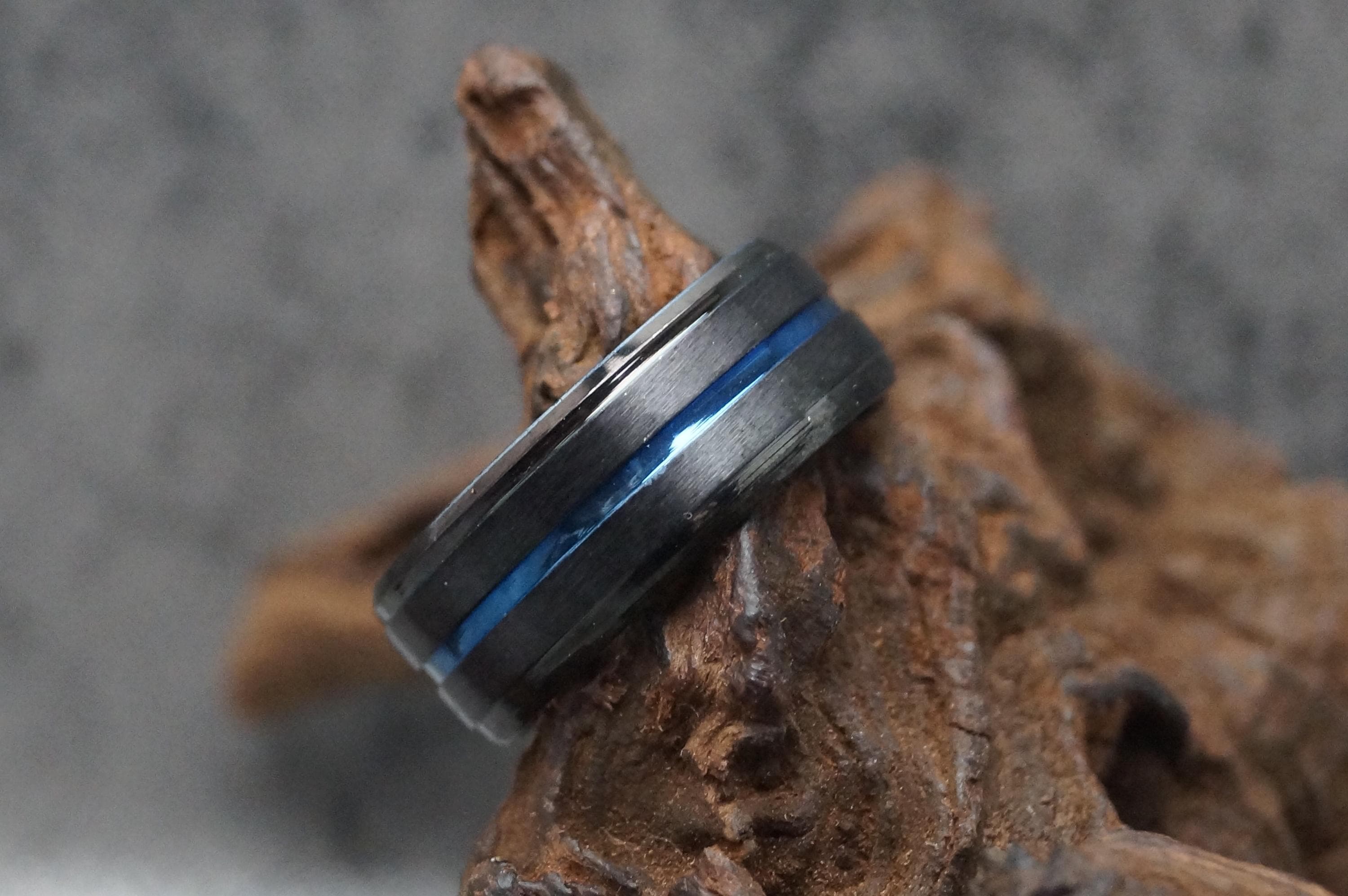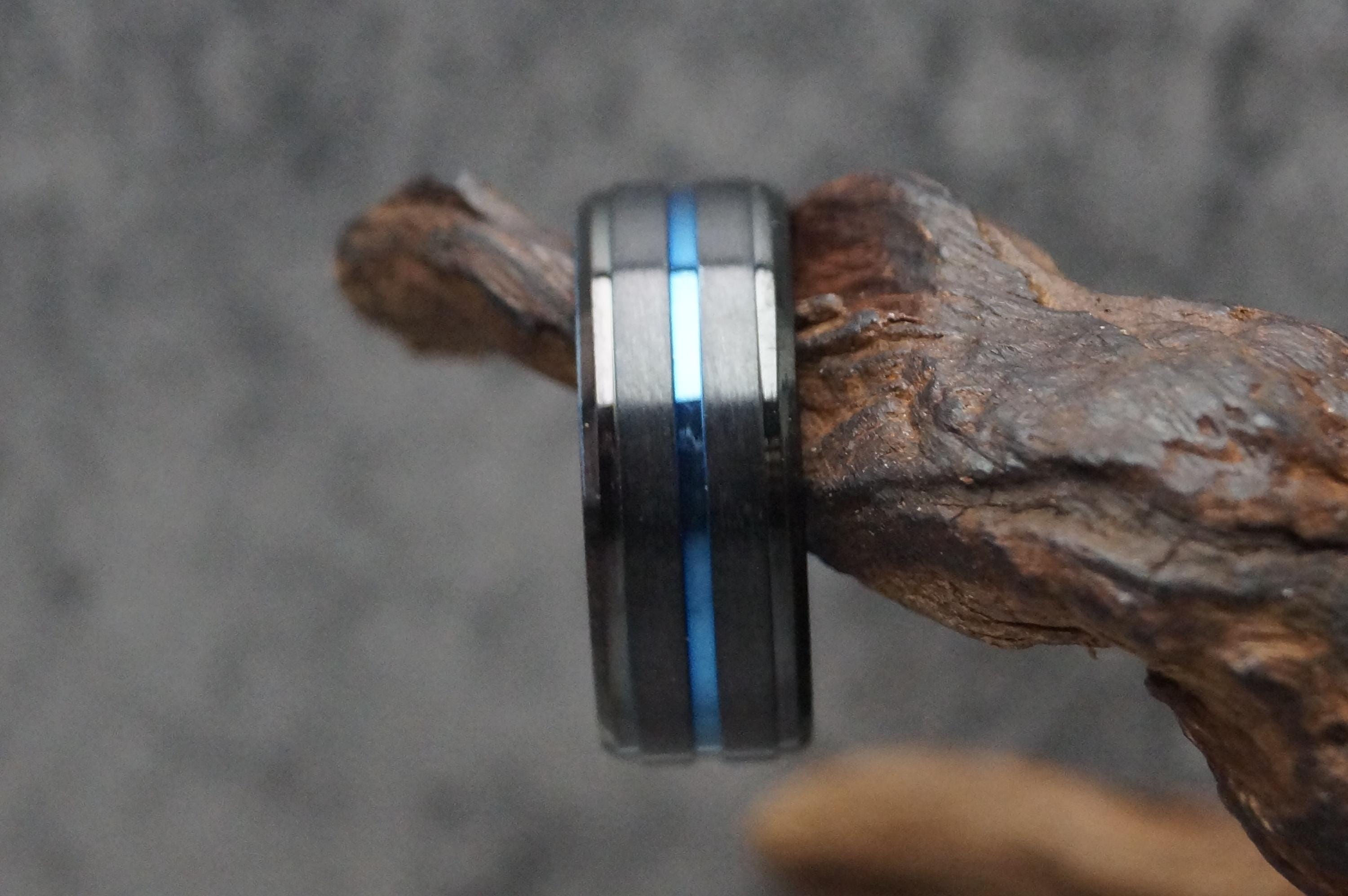 Black Tungsten Brushed Ring With Thin Blue Line Wedding Band Ring