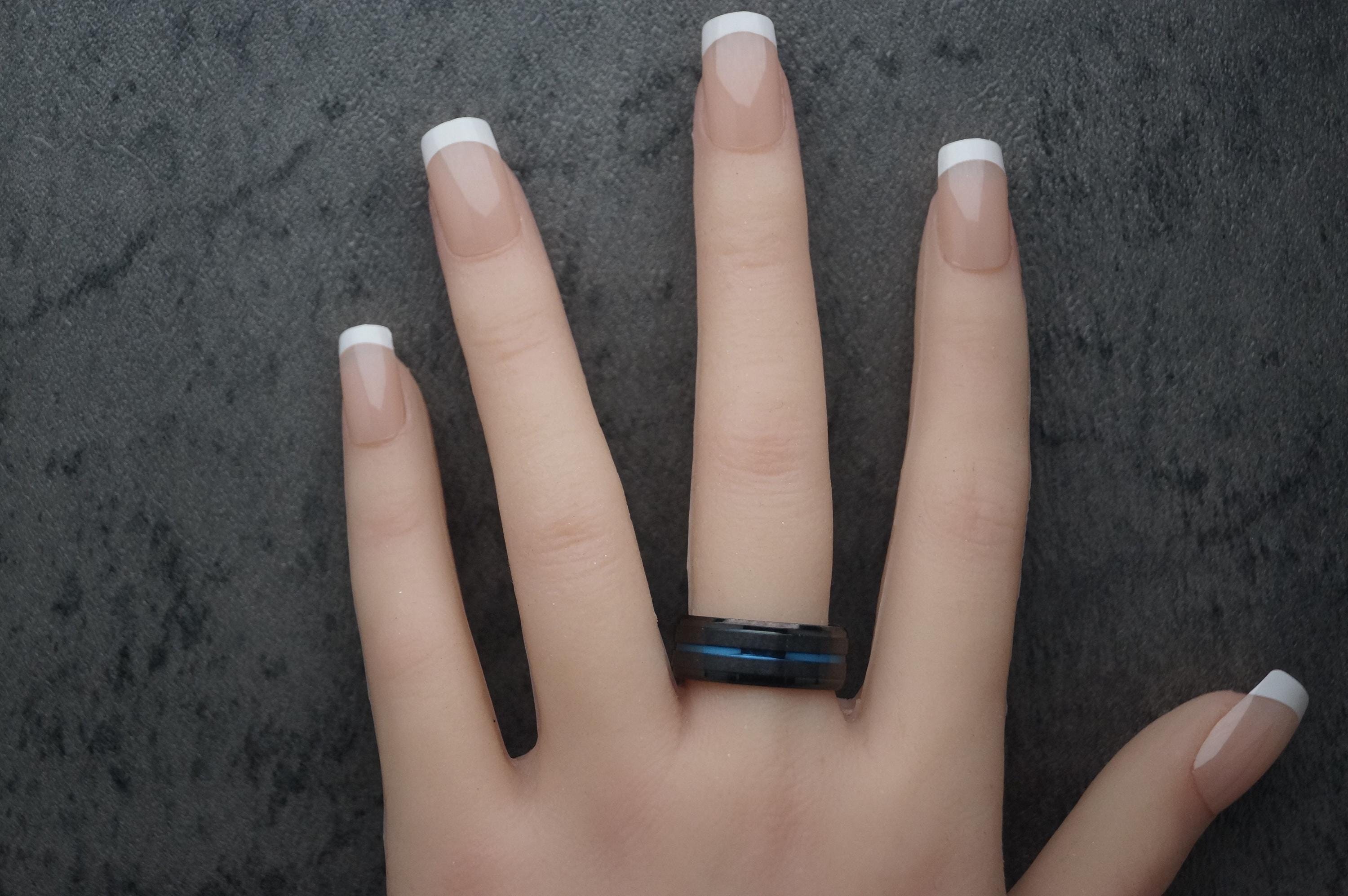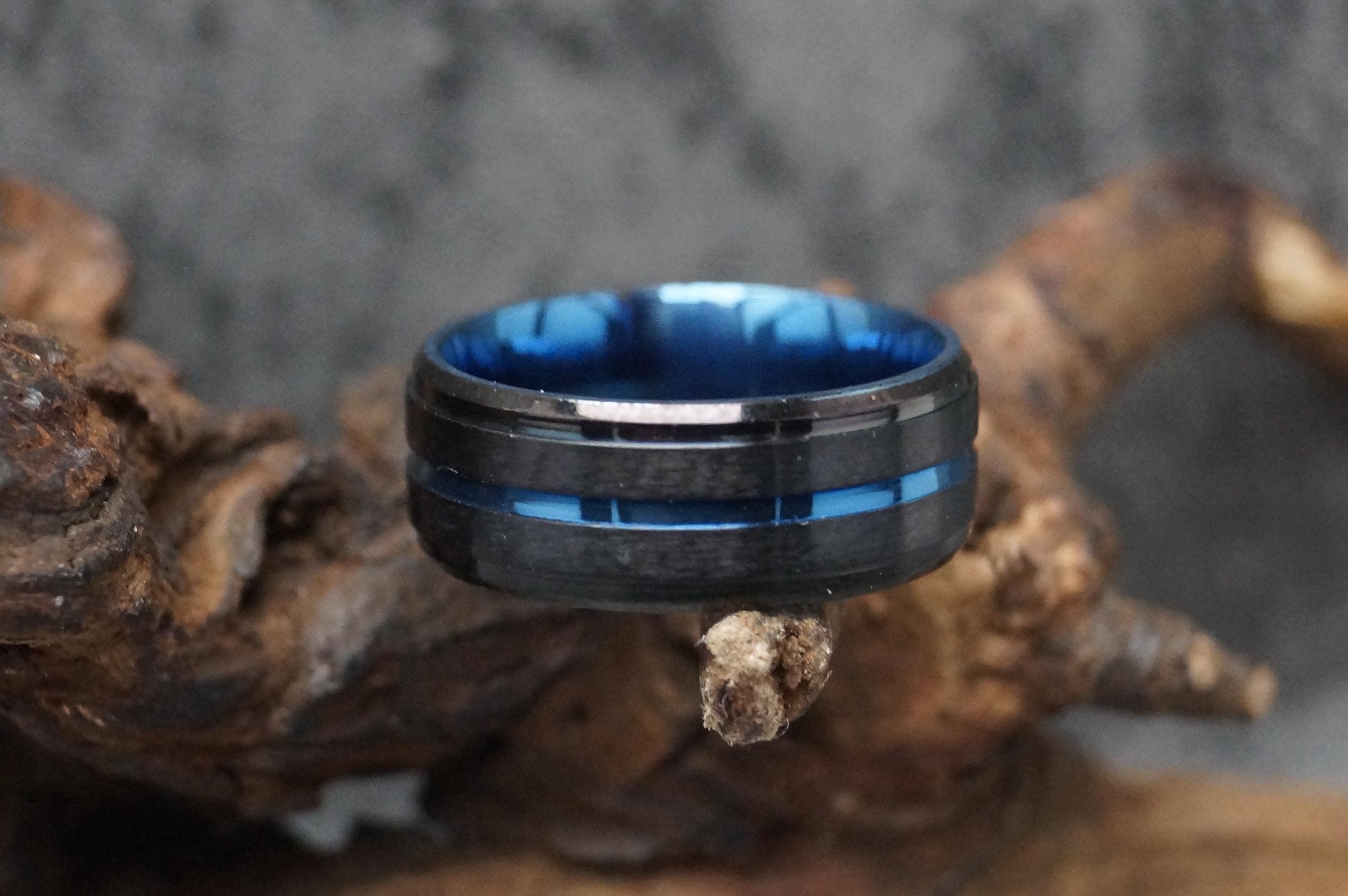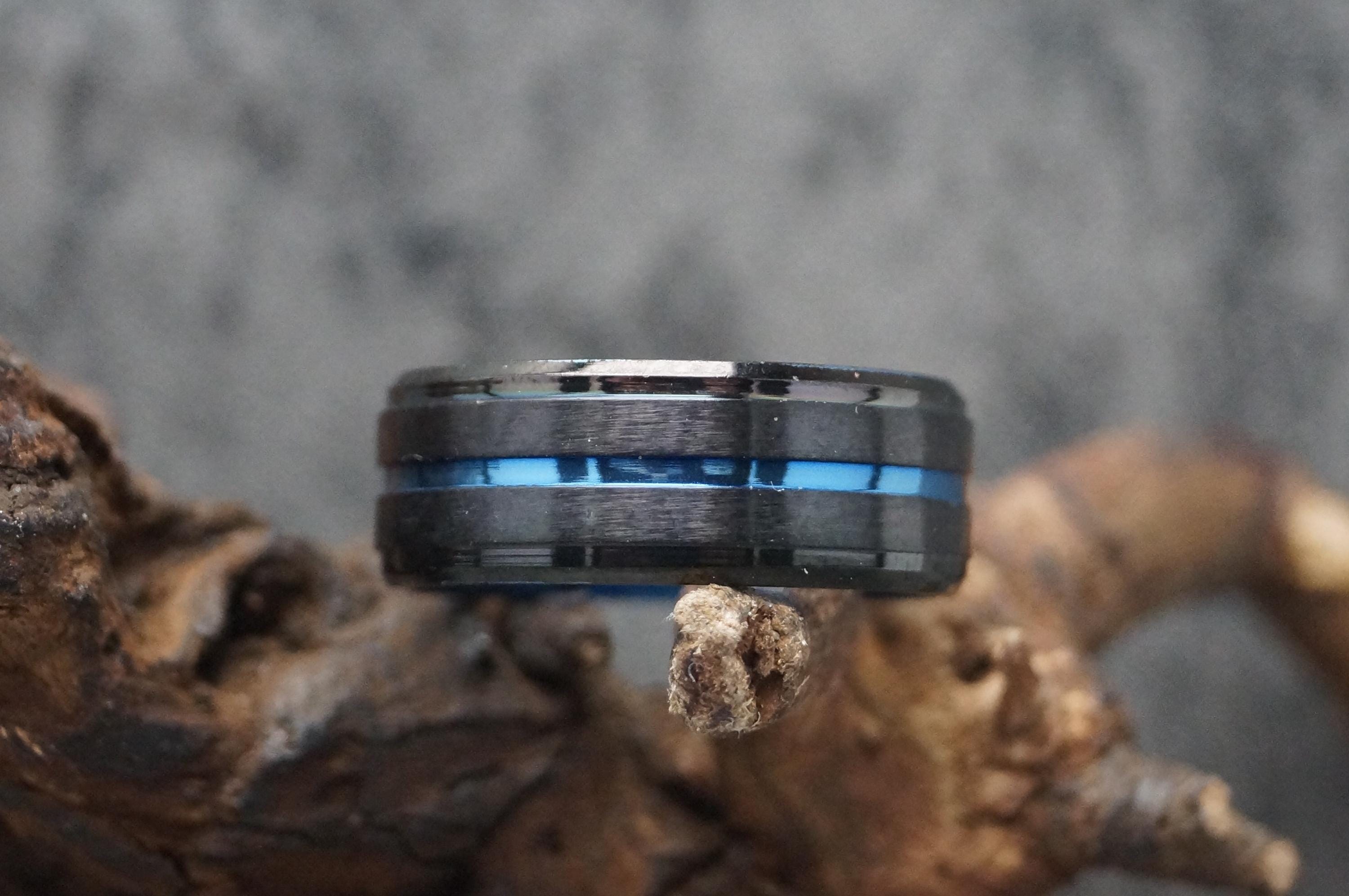 Black Tungsten Brushed Ring With Thin Blue Line Wedding Band Ring