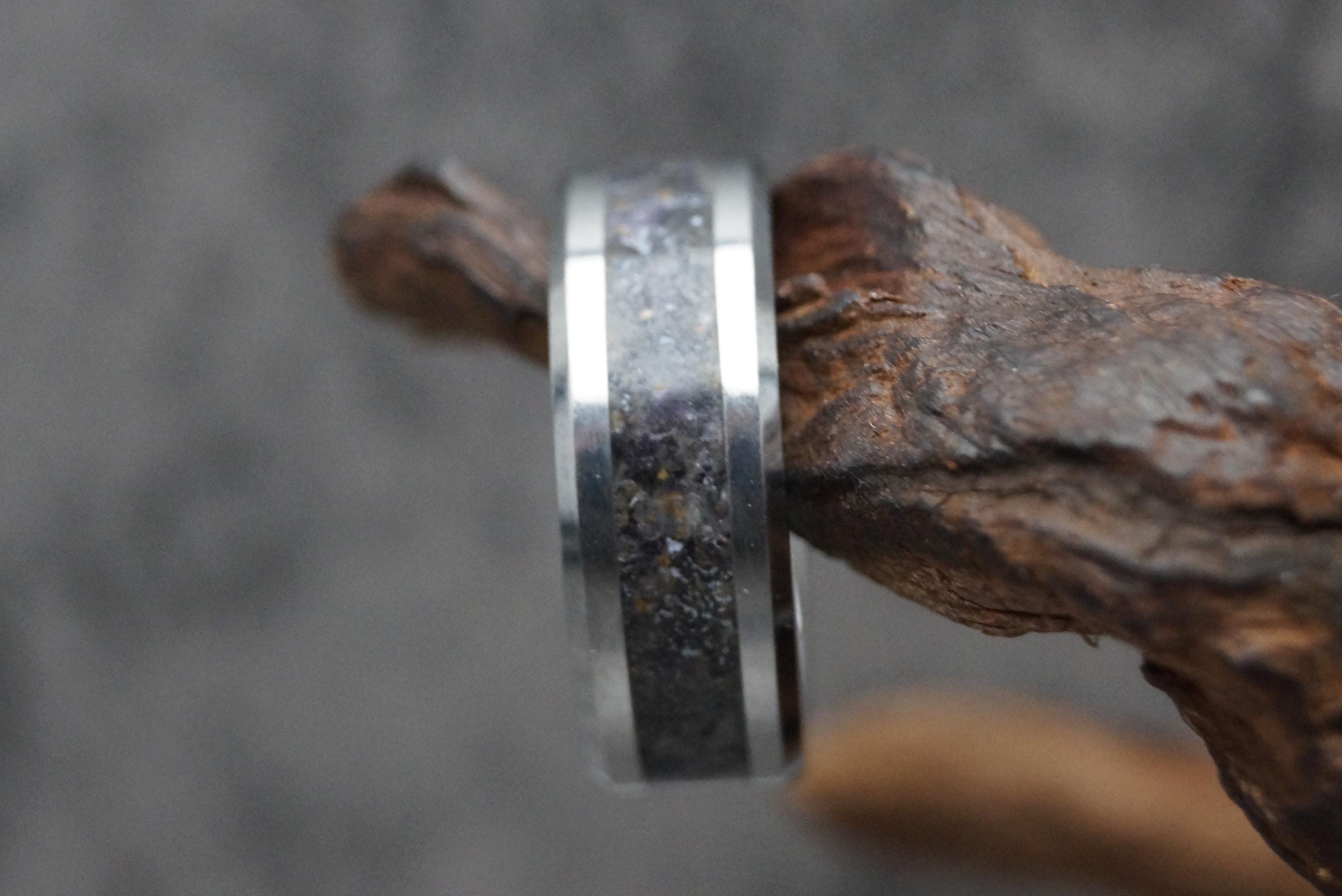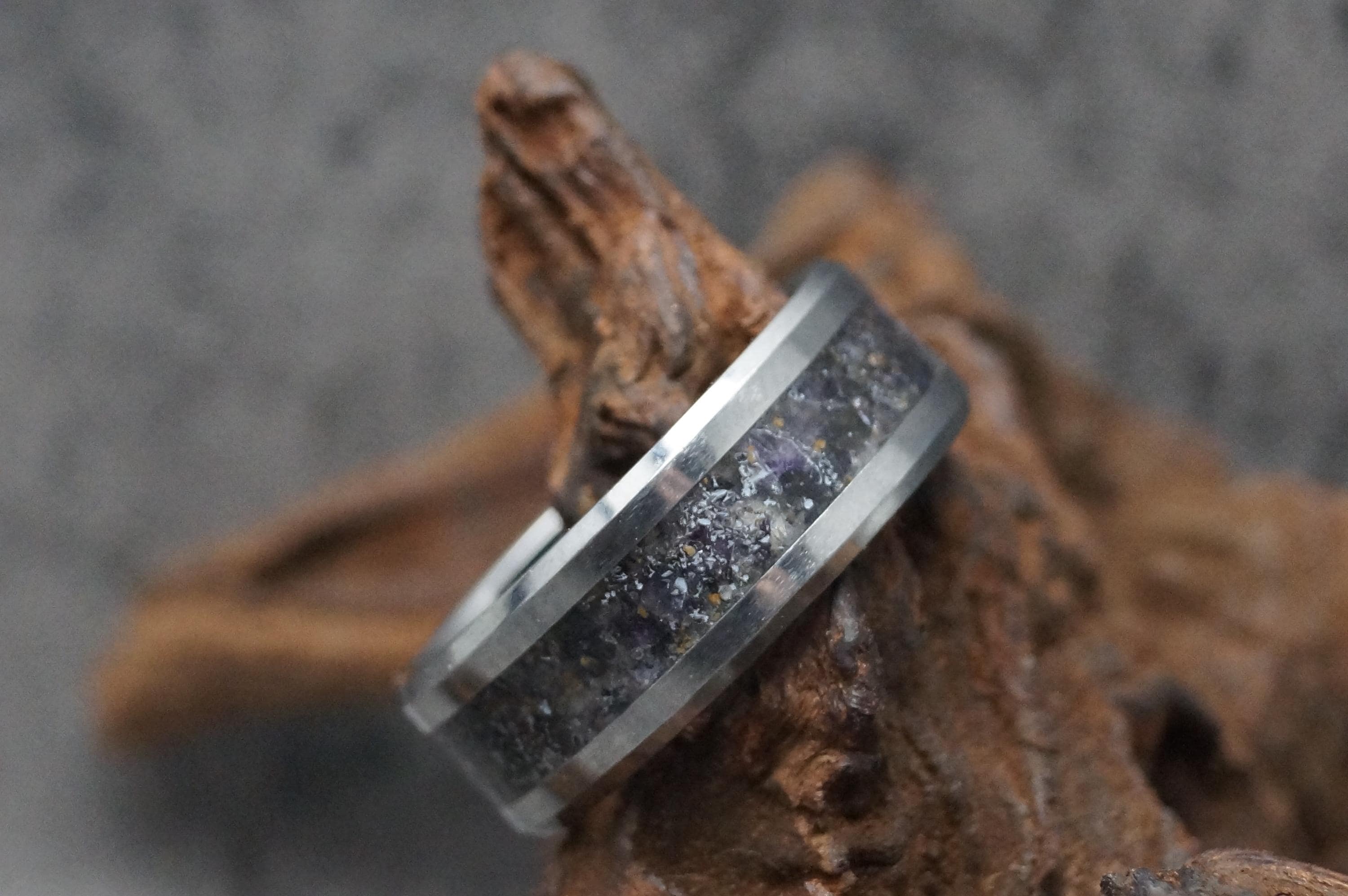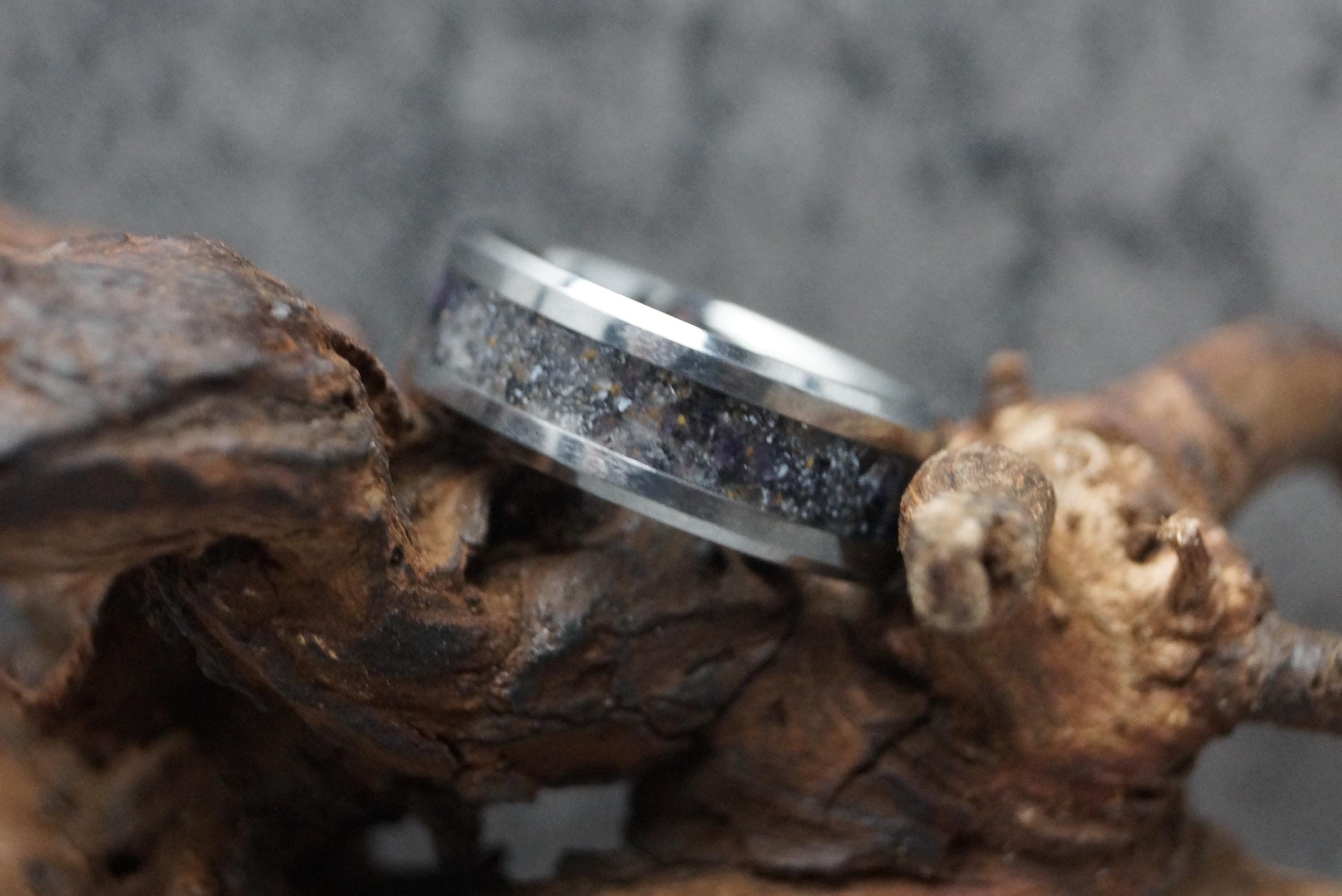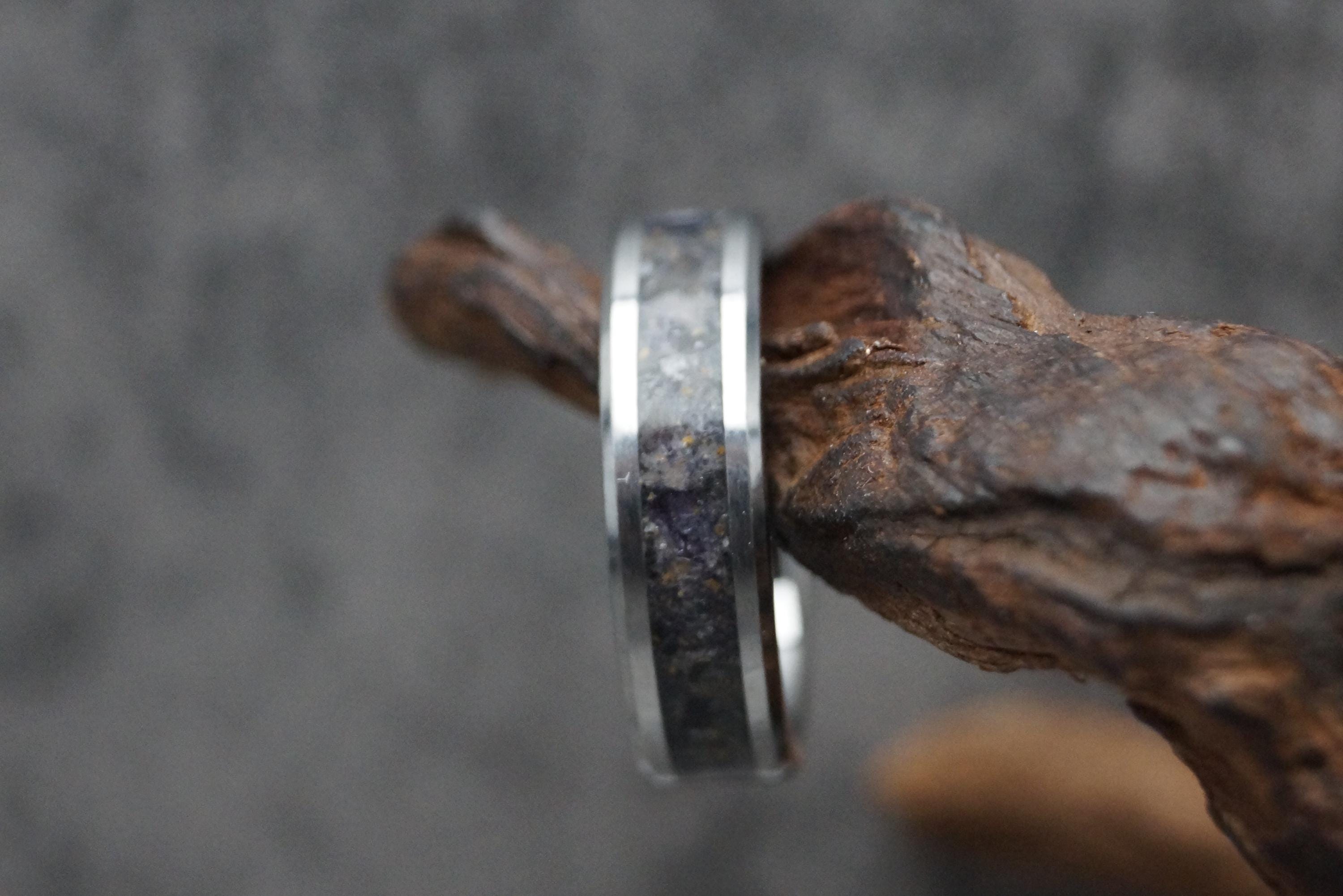 This genuine Tungsten Carbide ring inlaid with 100% Natural Blue John.