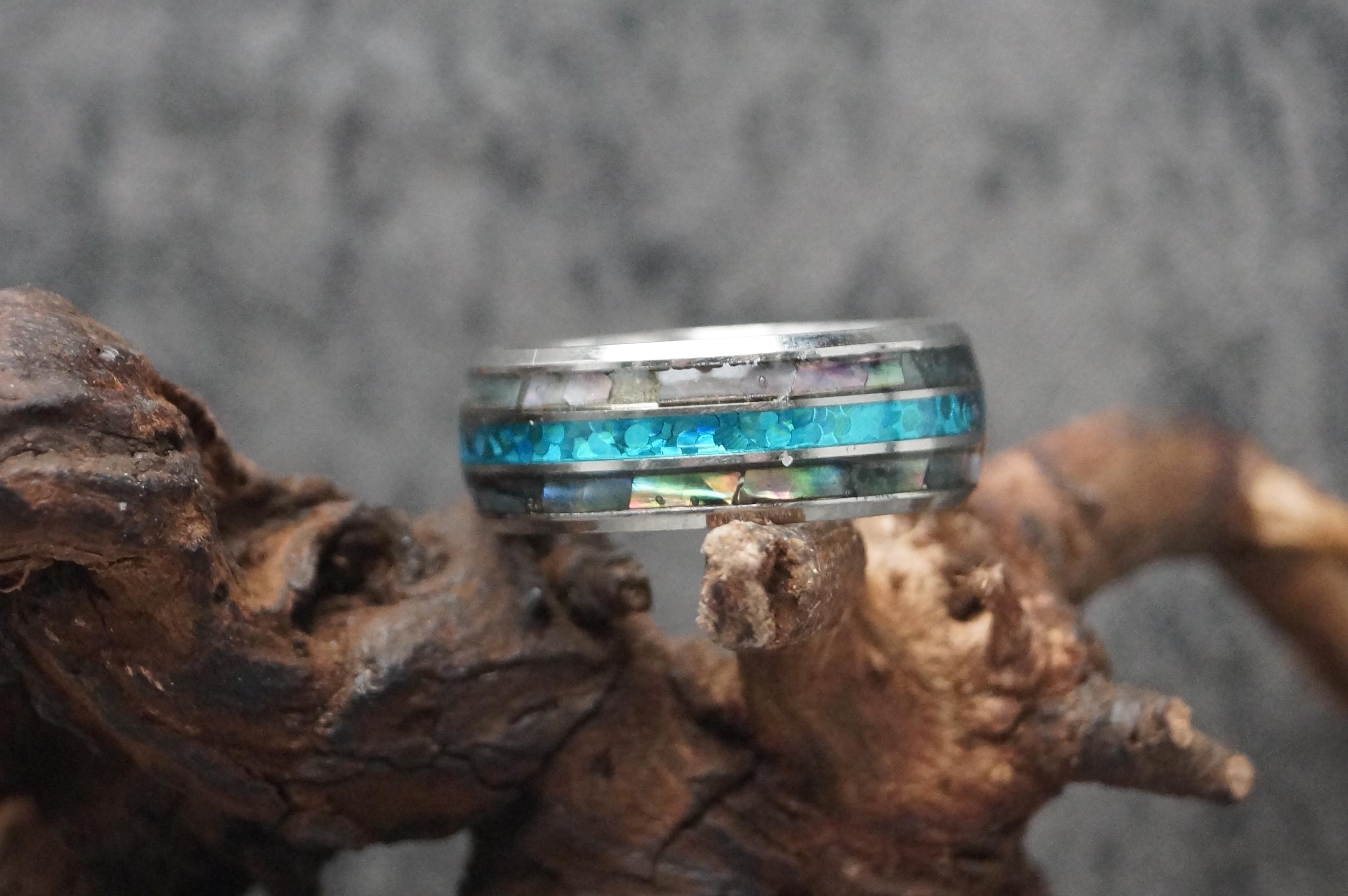 This genuine Tungsten Carbide ring is inlaid with 100% natural Abalone
