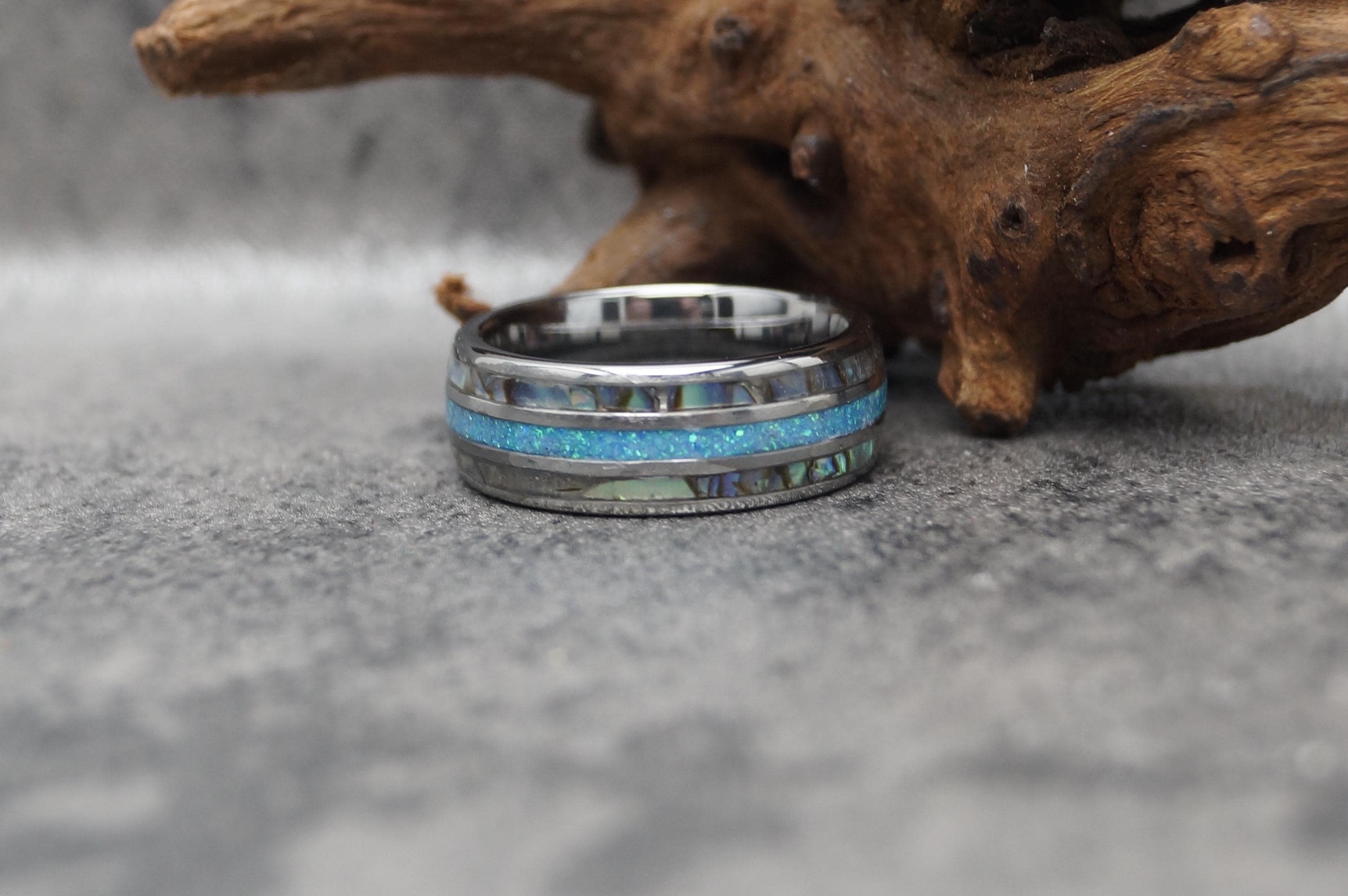 Abalone with Blue Opal Tungsten Wedding Bands 8 mm His and Hers Ring - Unique Ring