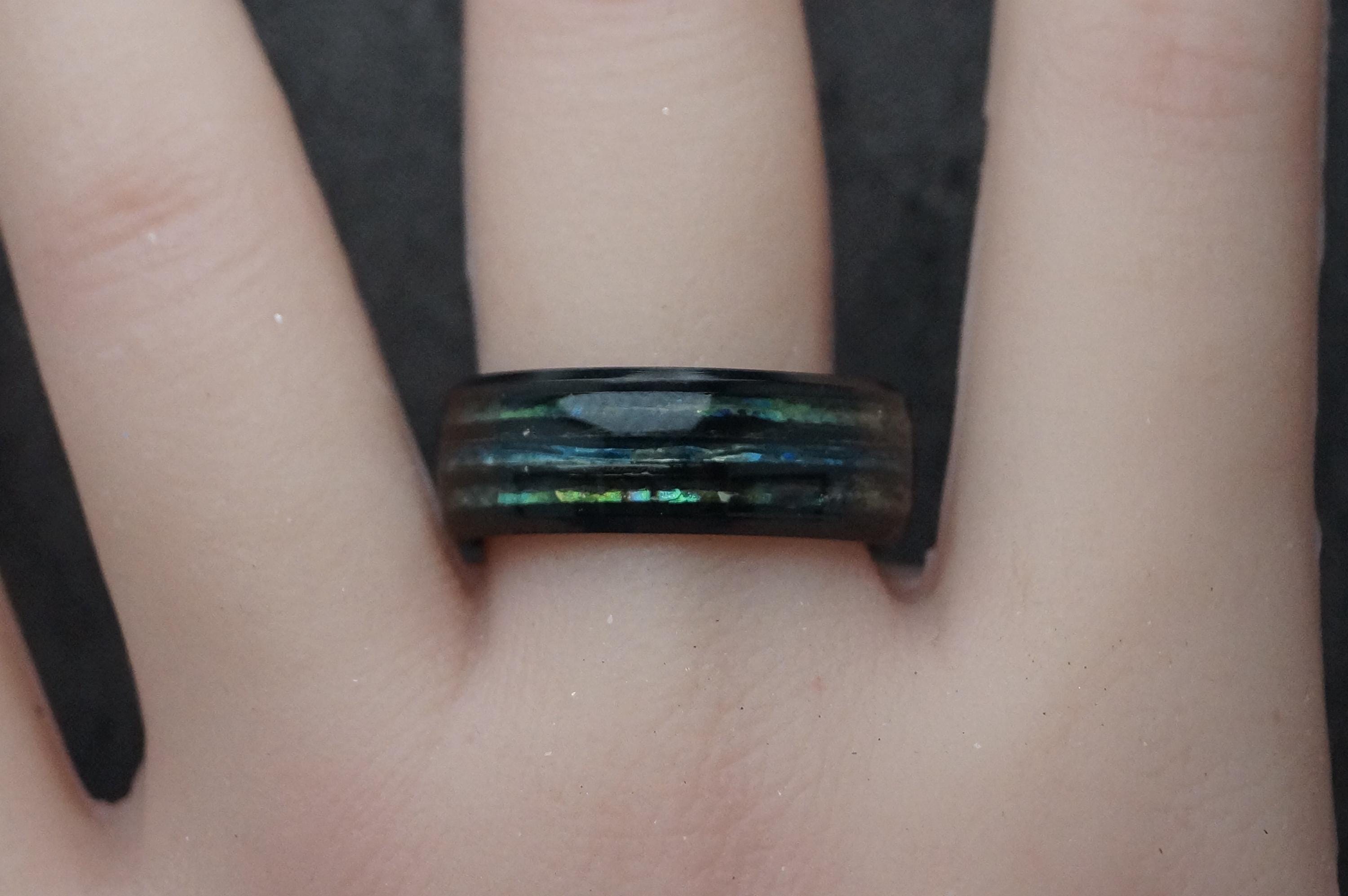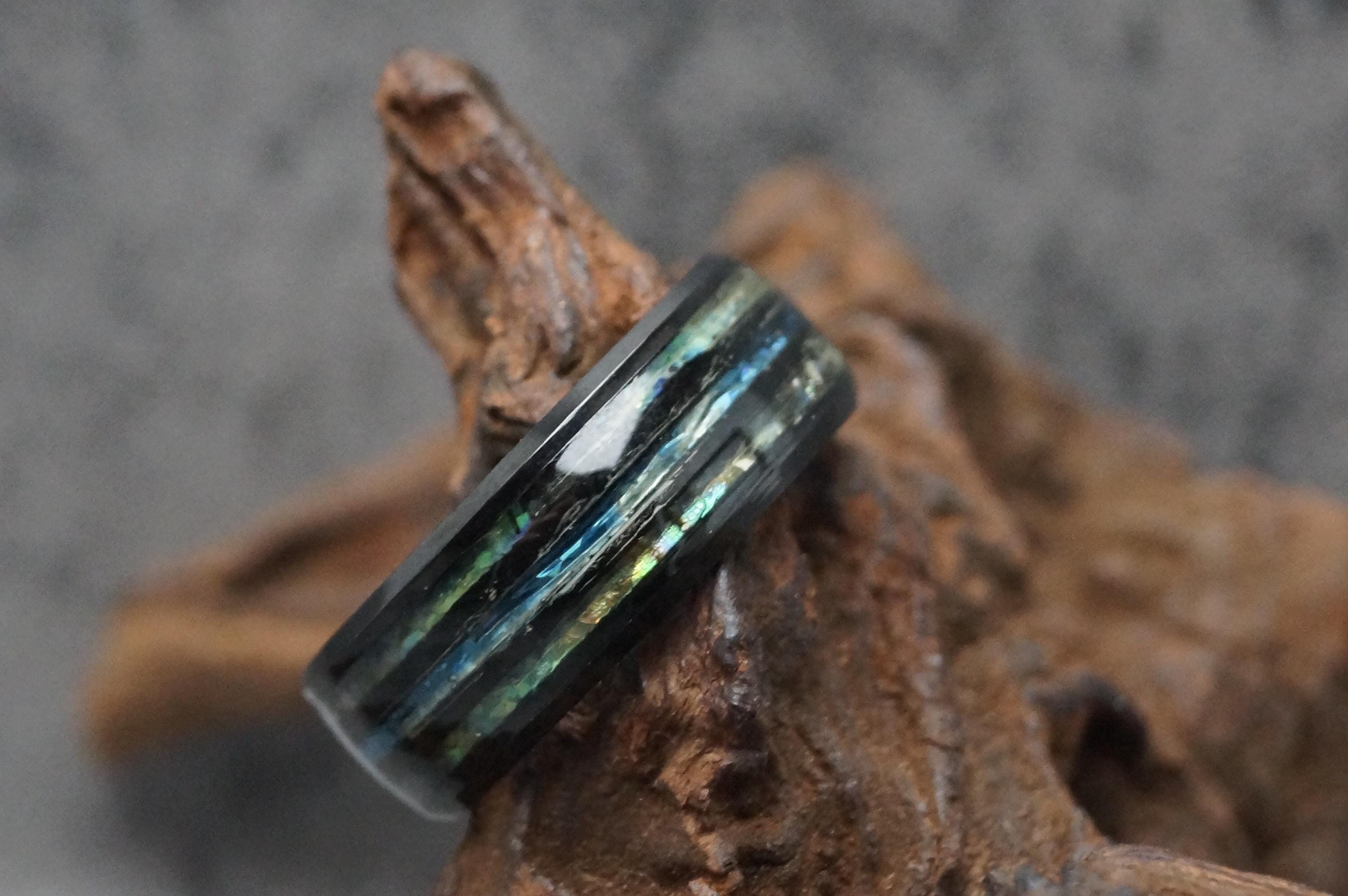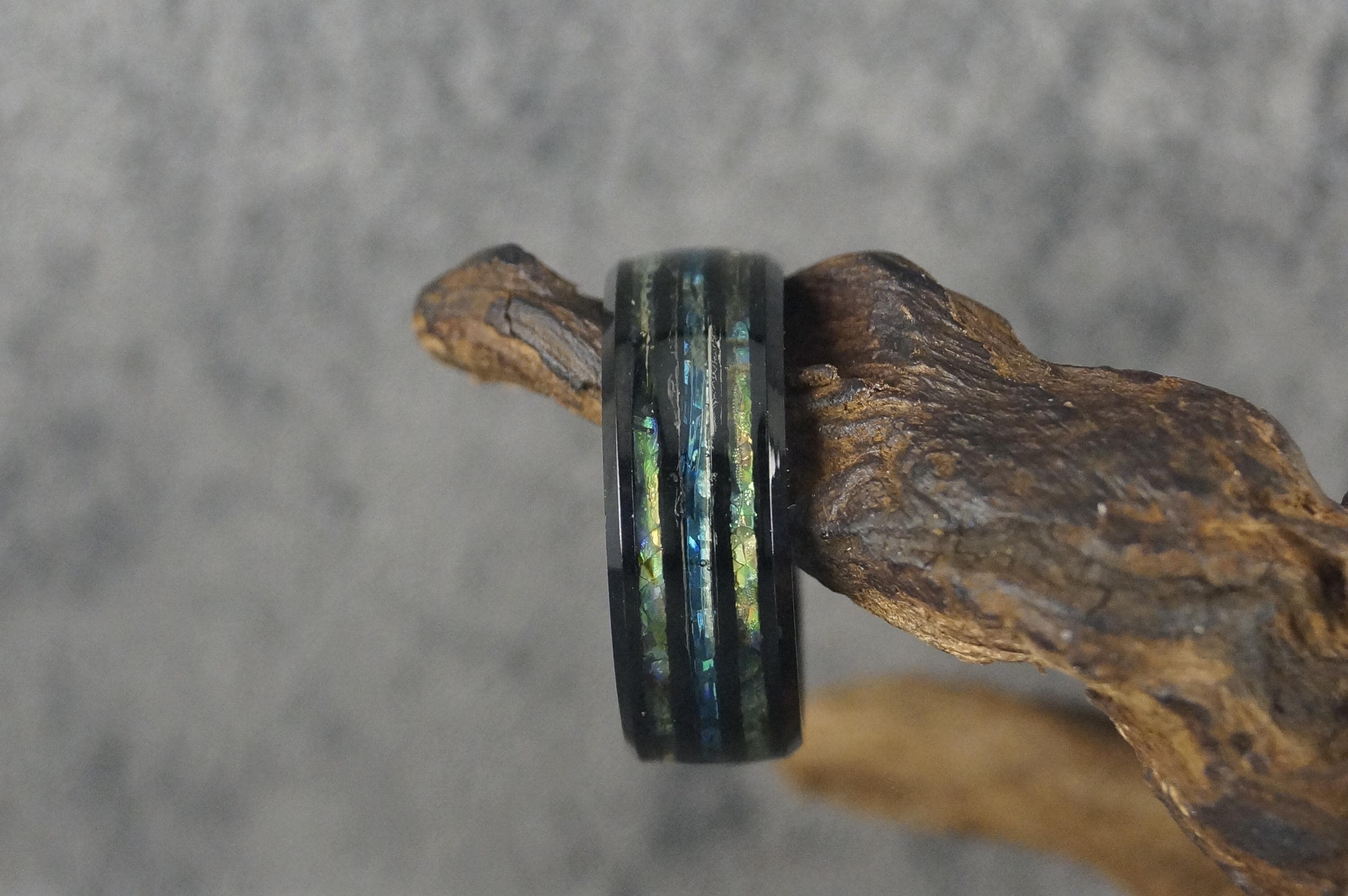 Black Tungsten Abalone Ring with Blue Opal Tungsten Wedding Bands 8 mm His and Hers Ring Unique Ring
