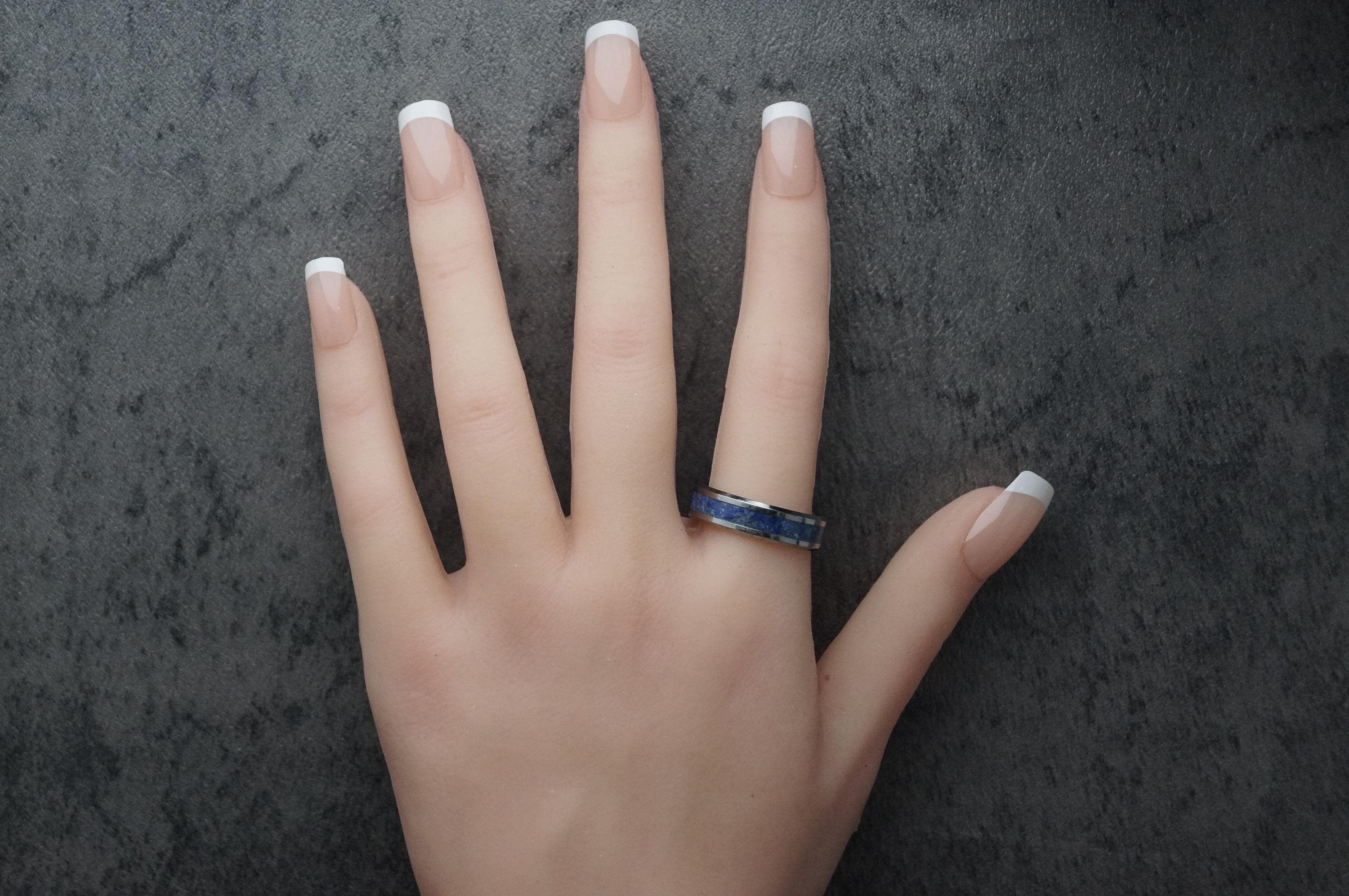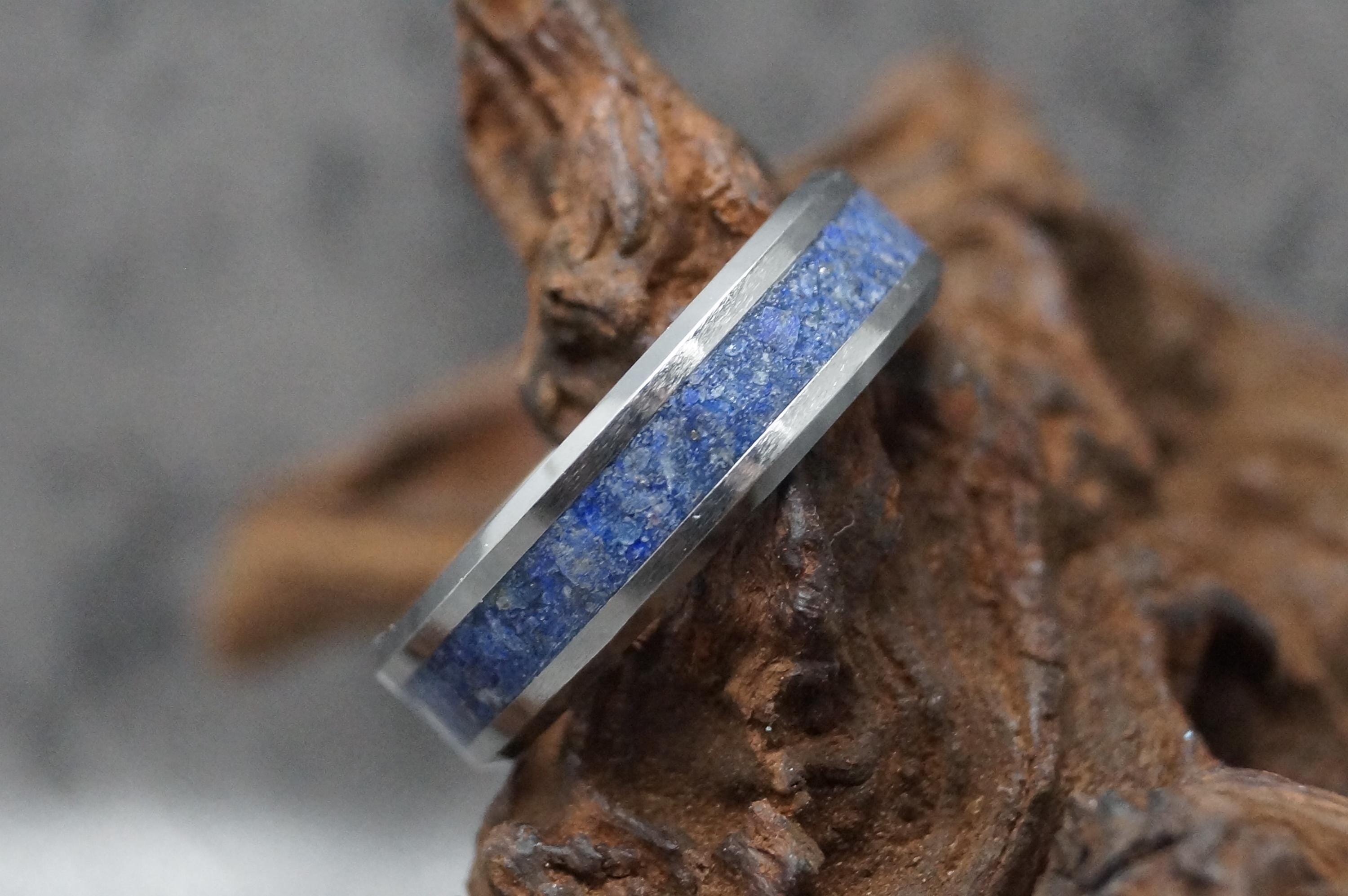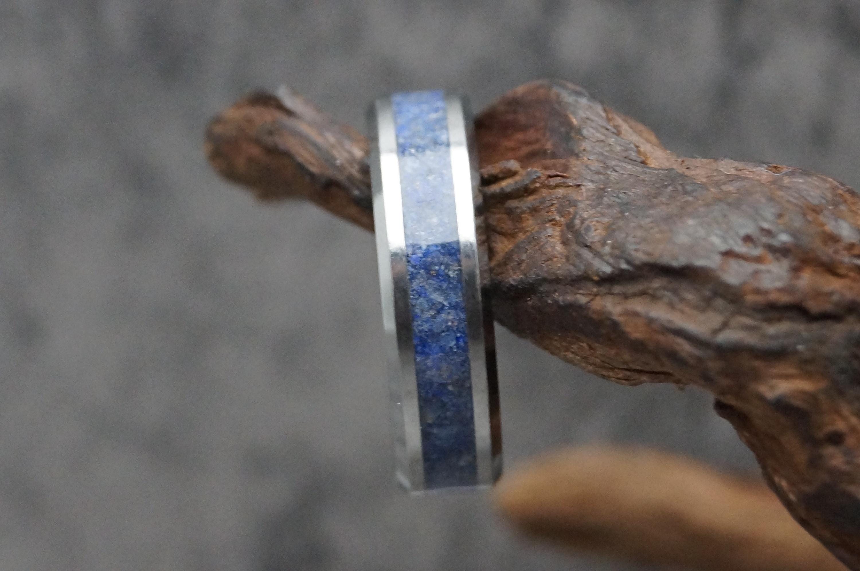This genuine Tungsten Carbide ring inlaid with 100% Natural Lapis Lazuli.