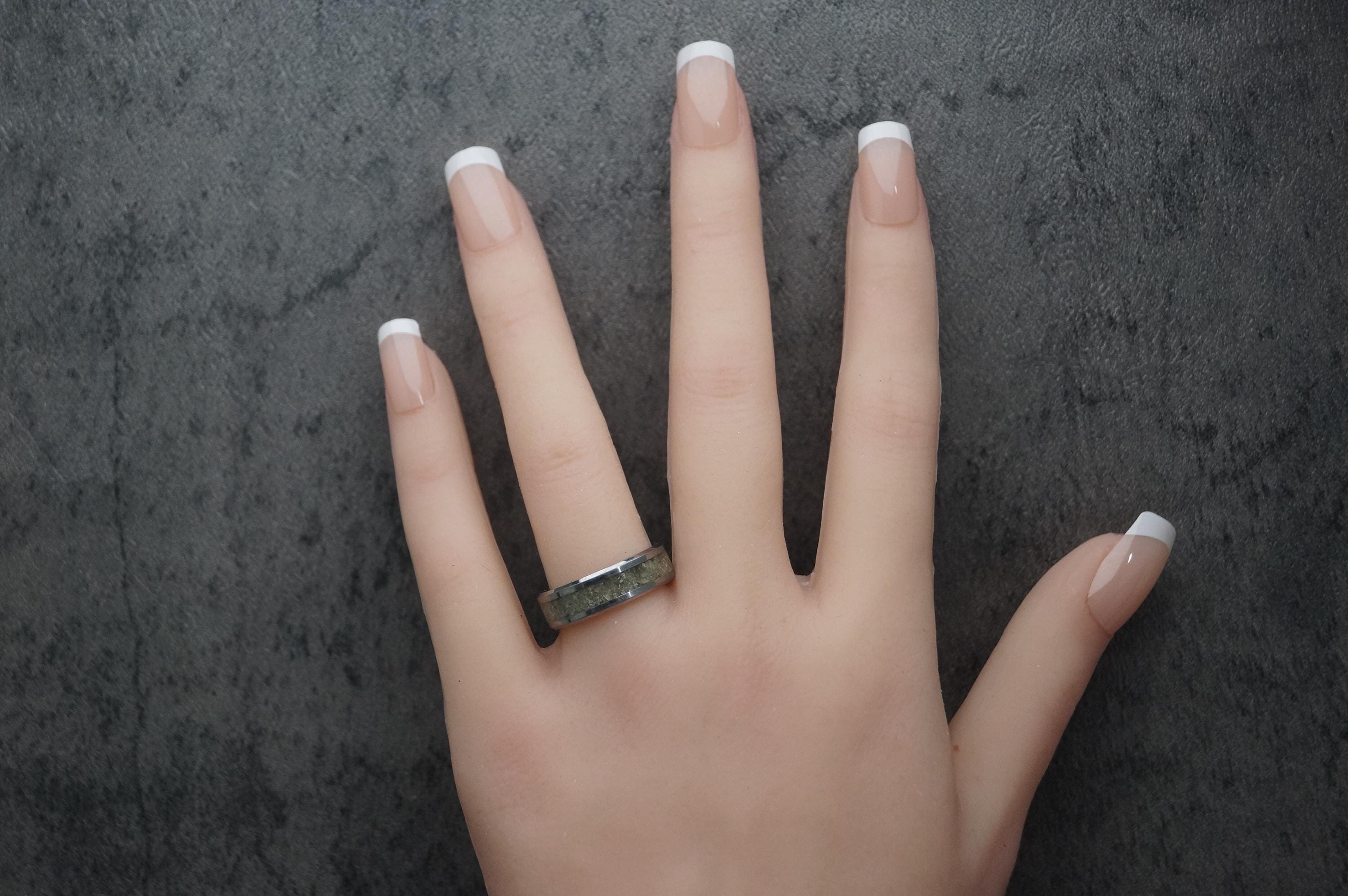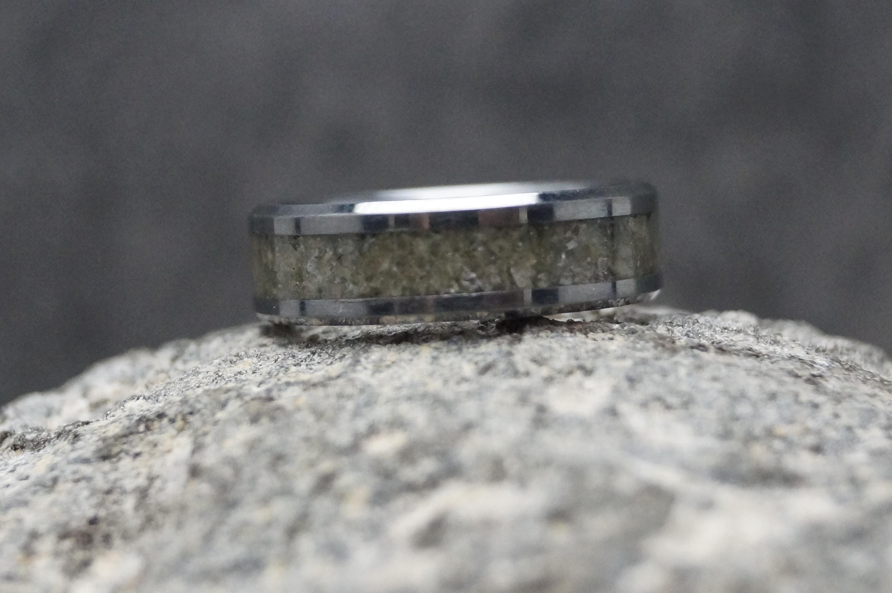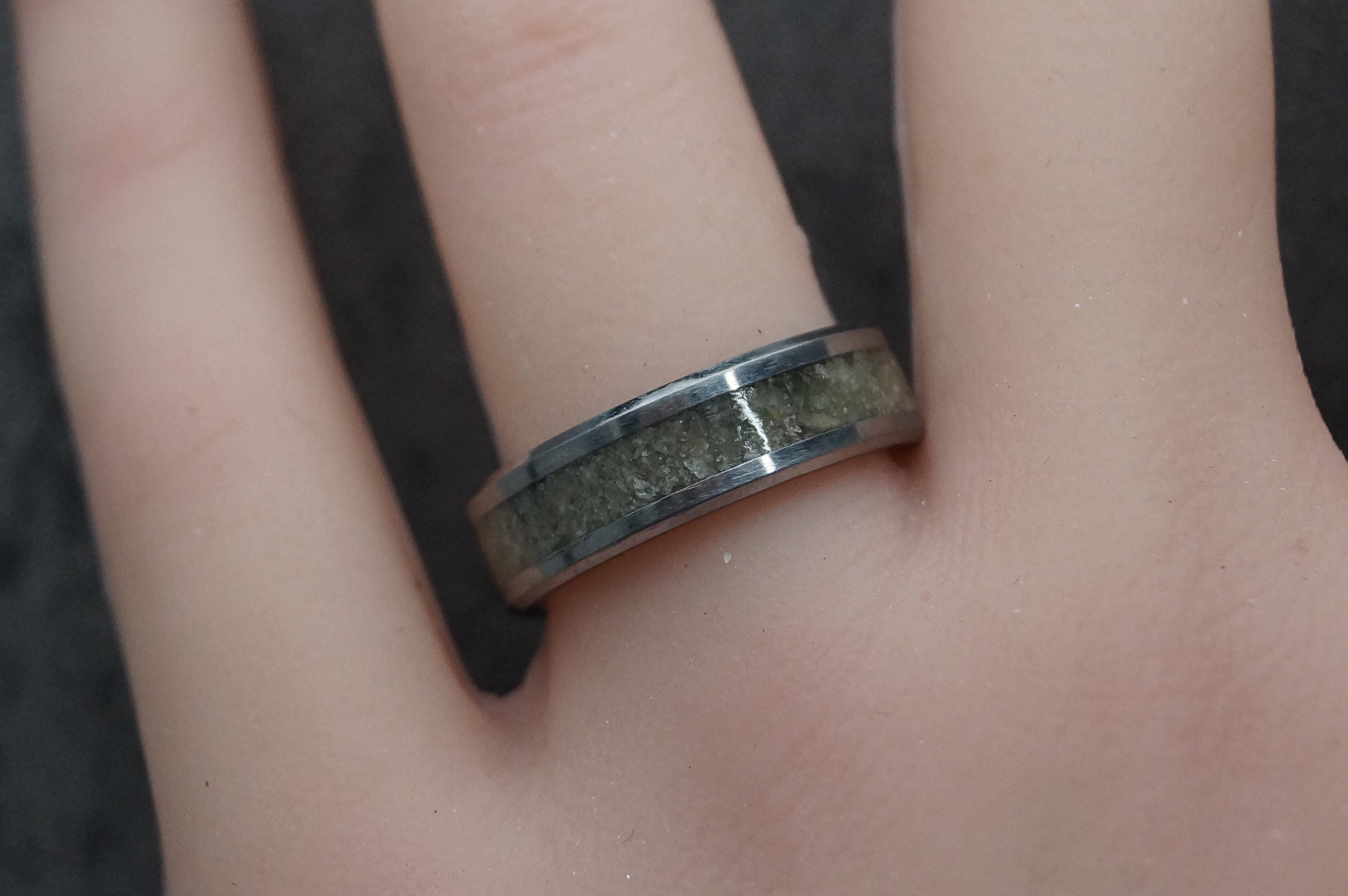 This genuine Tungsten Carbide ring inlaid with 100% Natural Green Apatite.