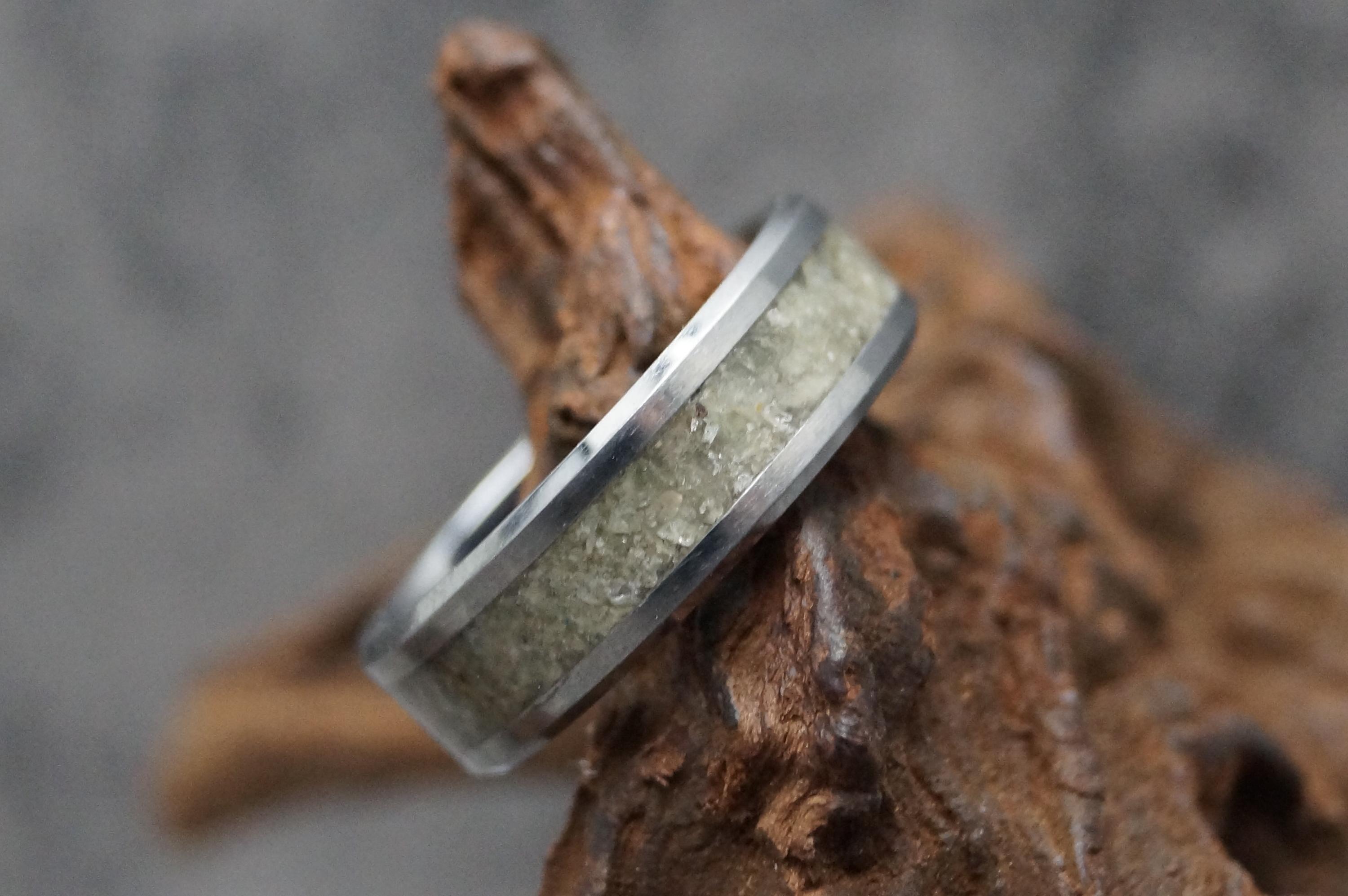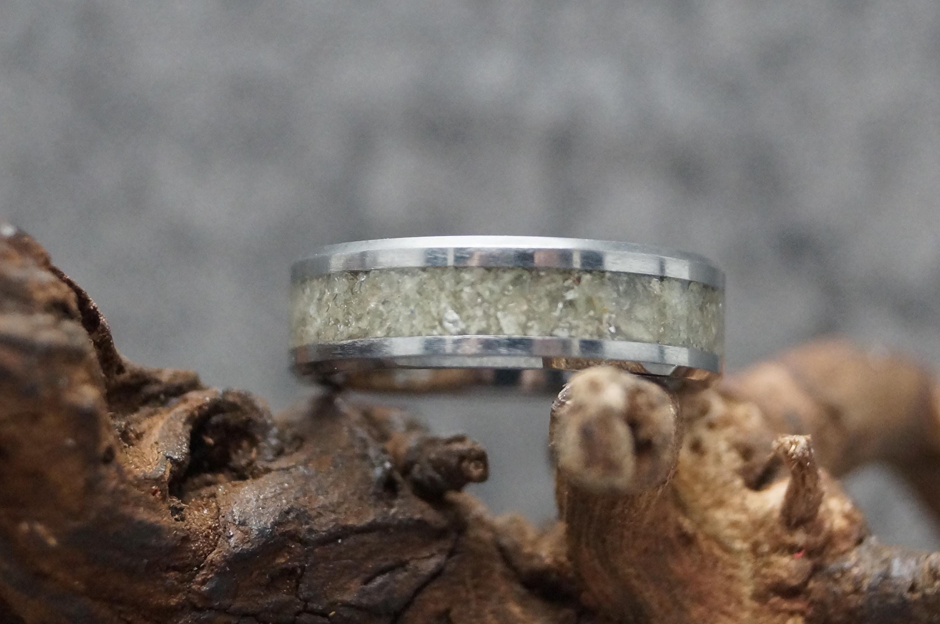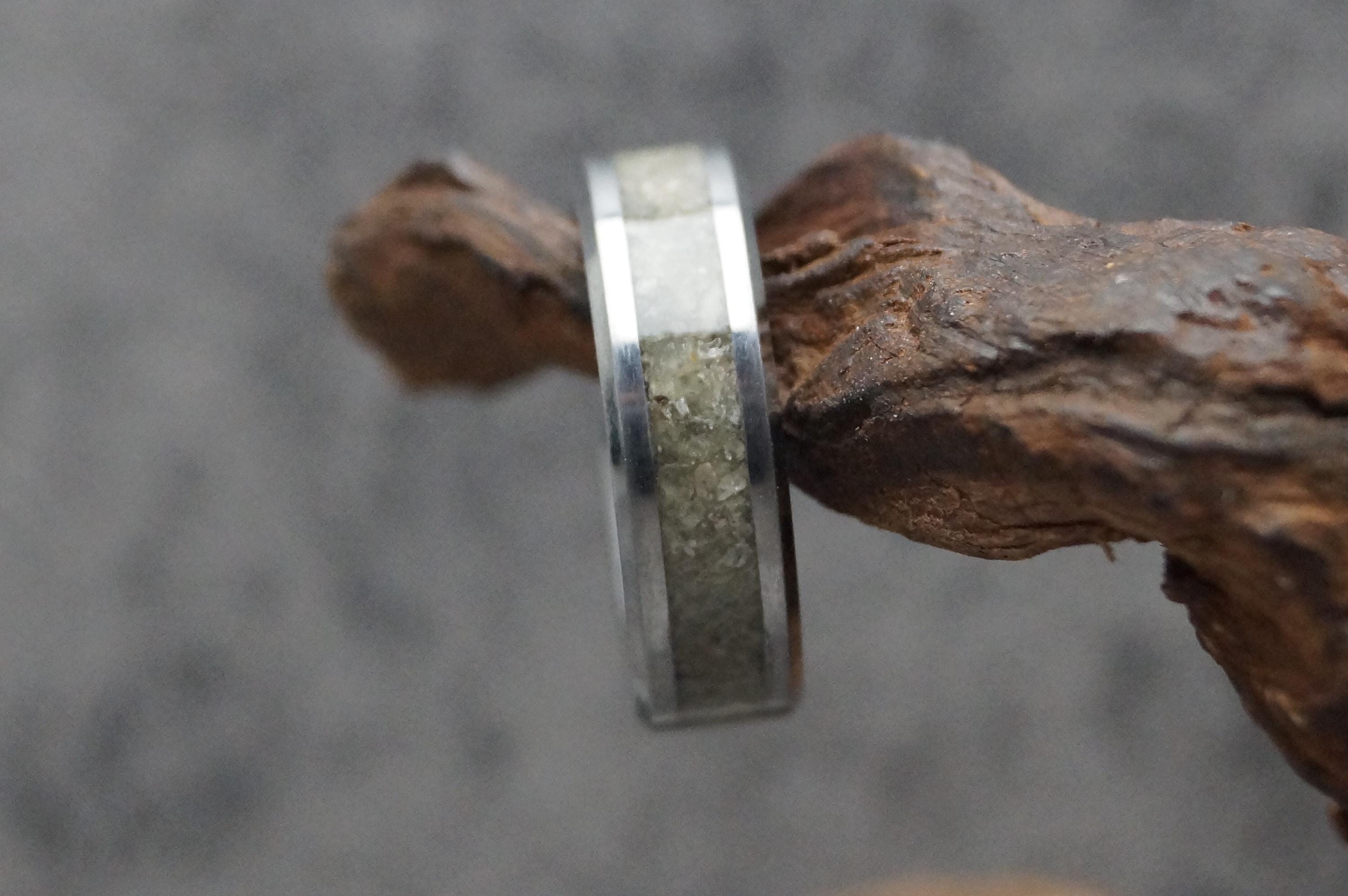 This genuine Tungsten Carbide ring inlaid with 100% Natural Green Apatite.
