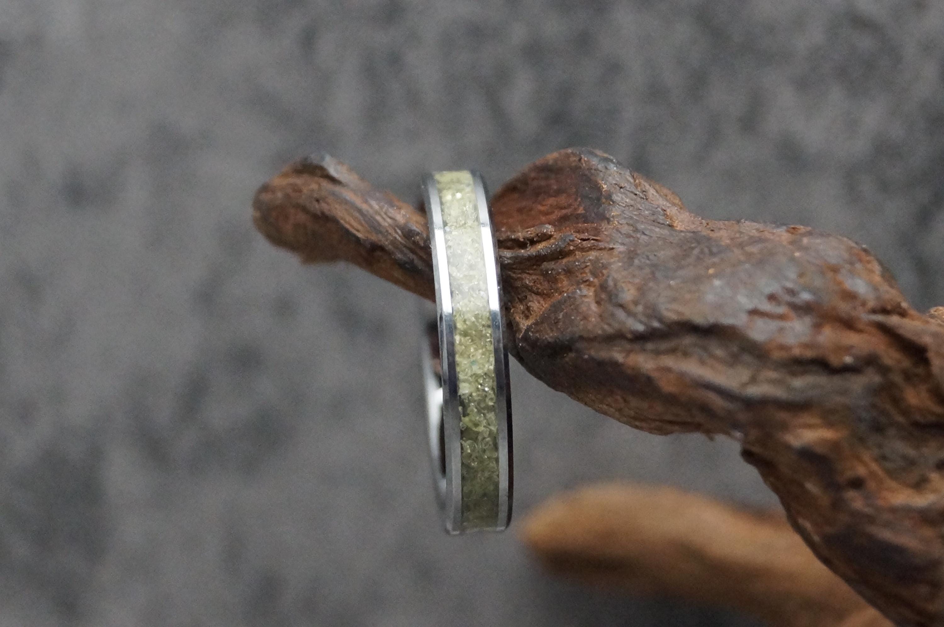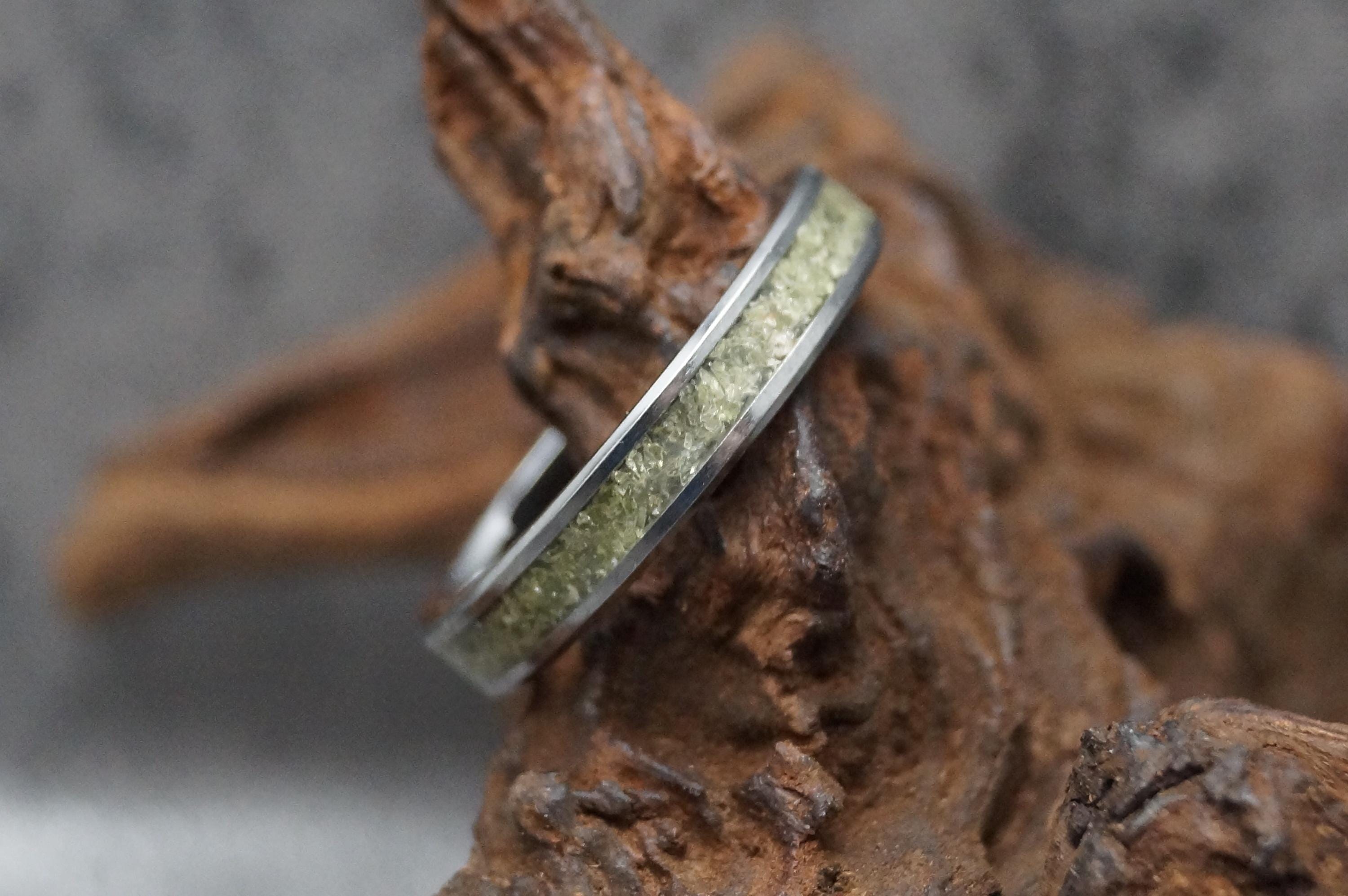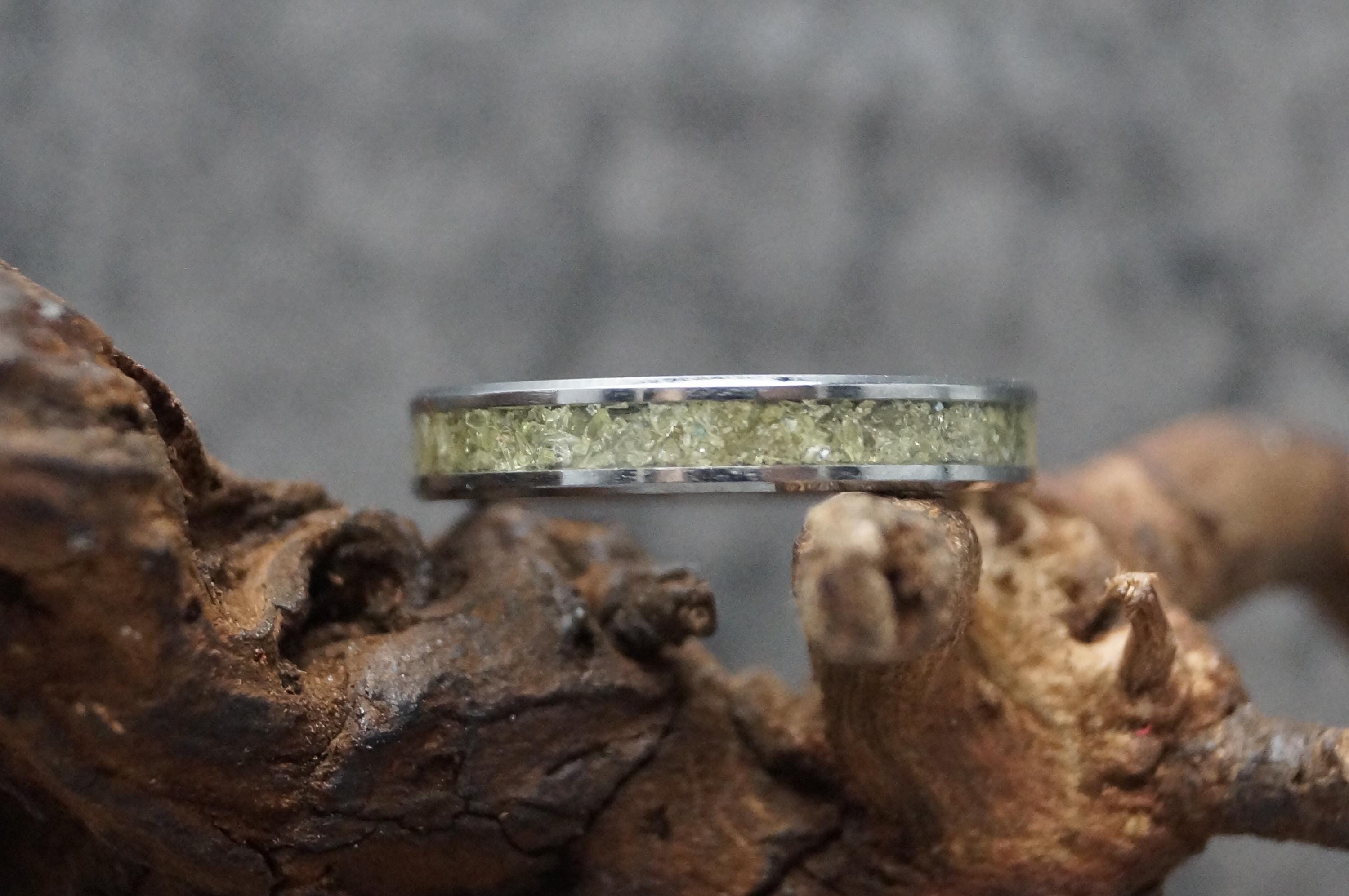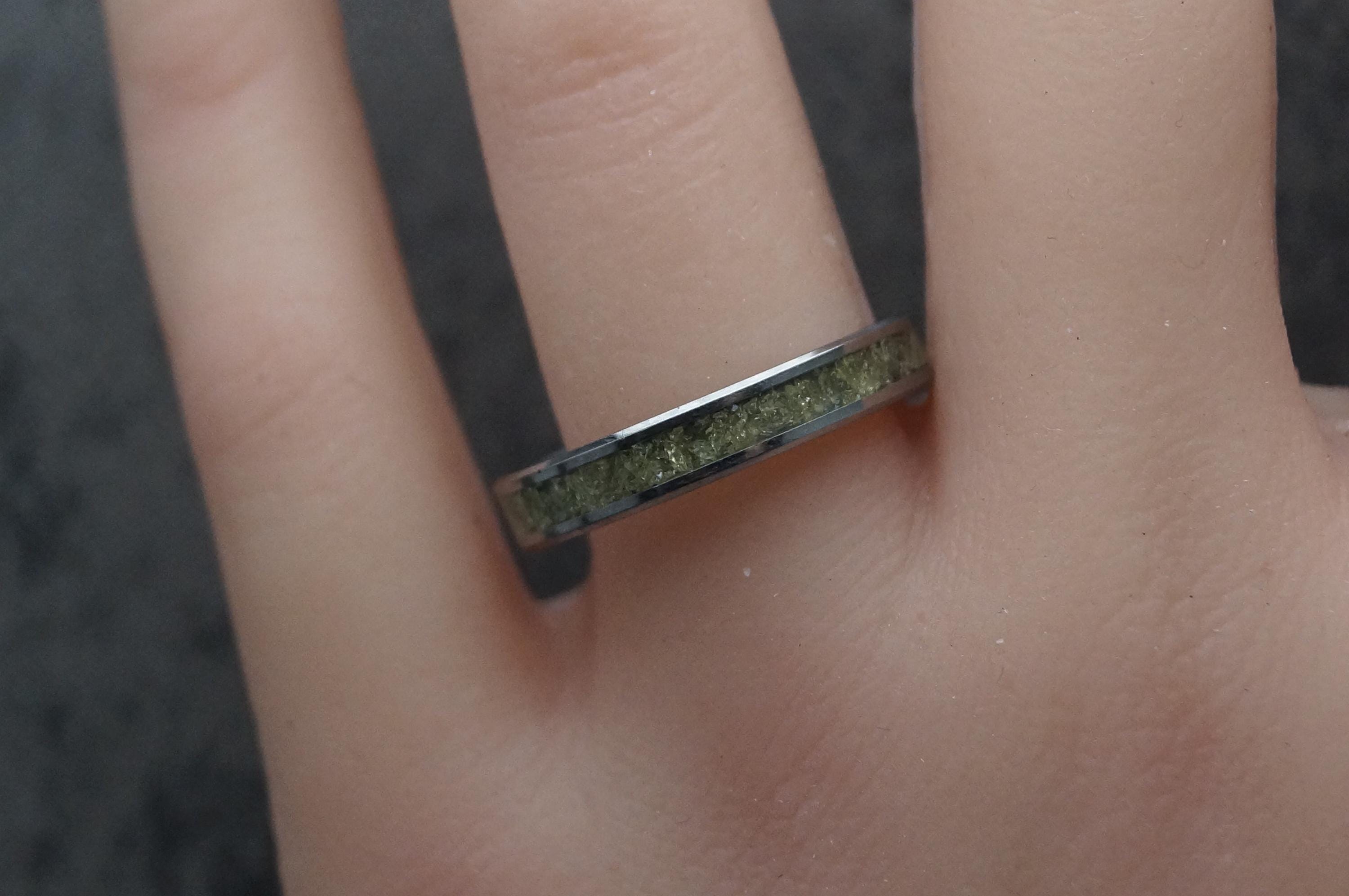 This genuine Tungsten Carbide ring inlaid with 100% Natural Moldavite Impact Glass.