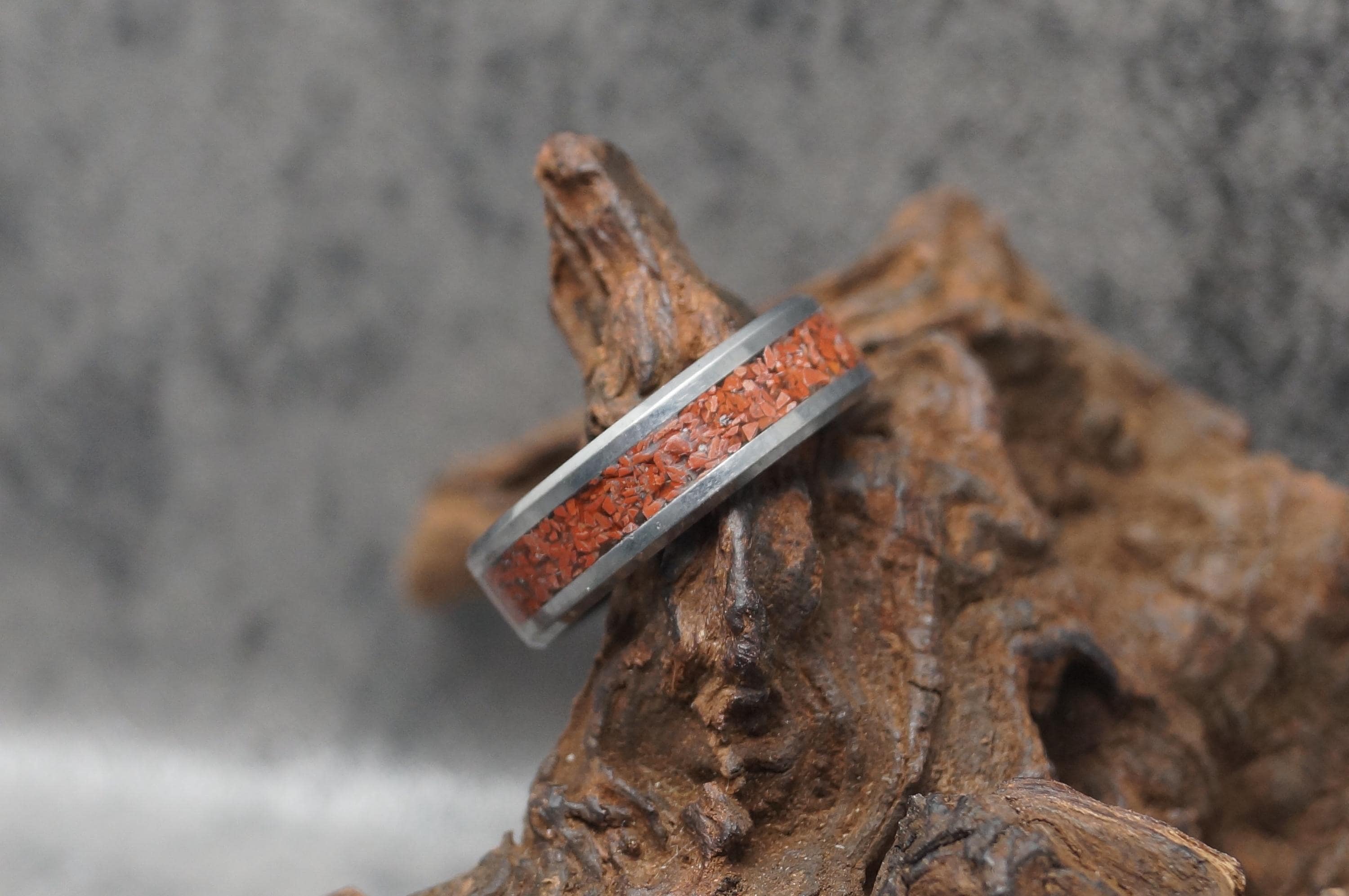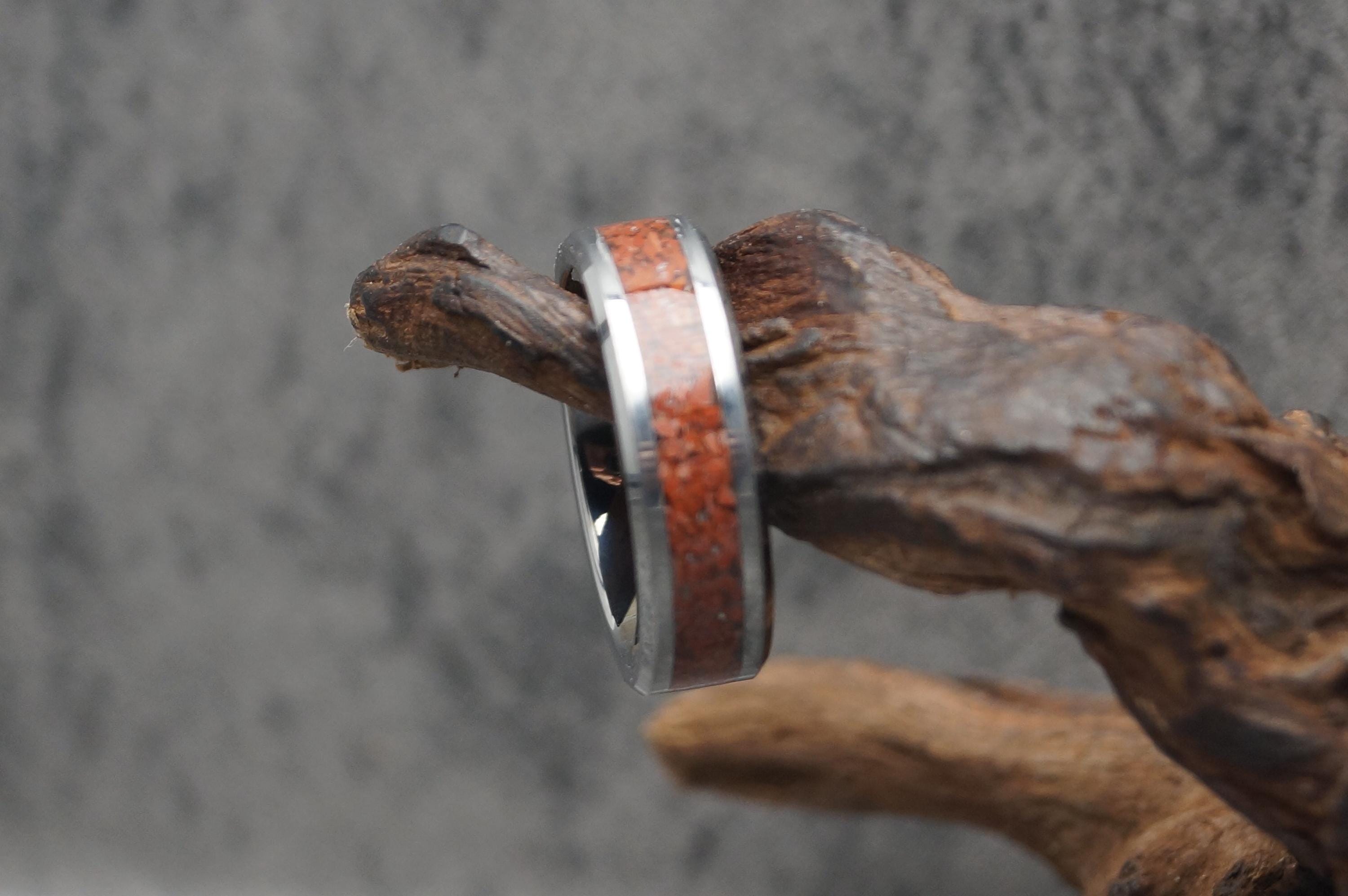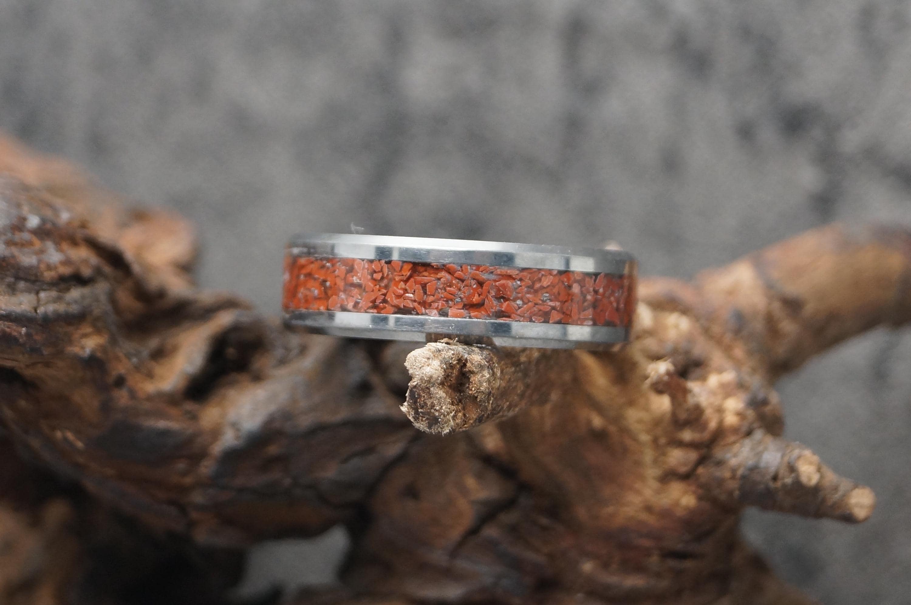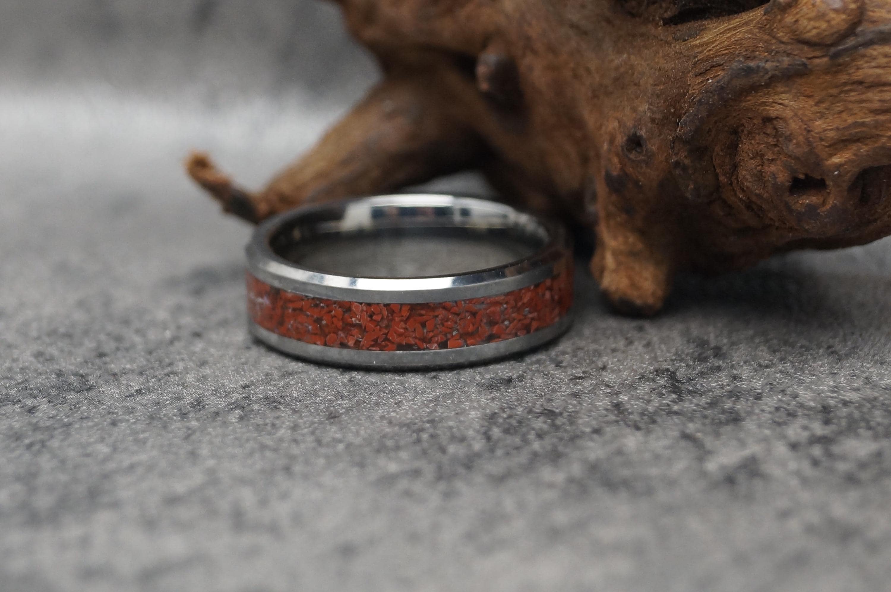 This genuine Tungsten Carbide ring inlaid with 100% Natural Red Jasper.