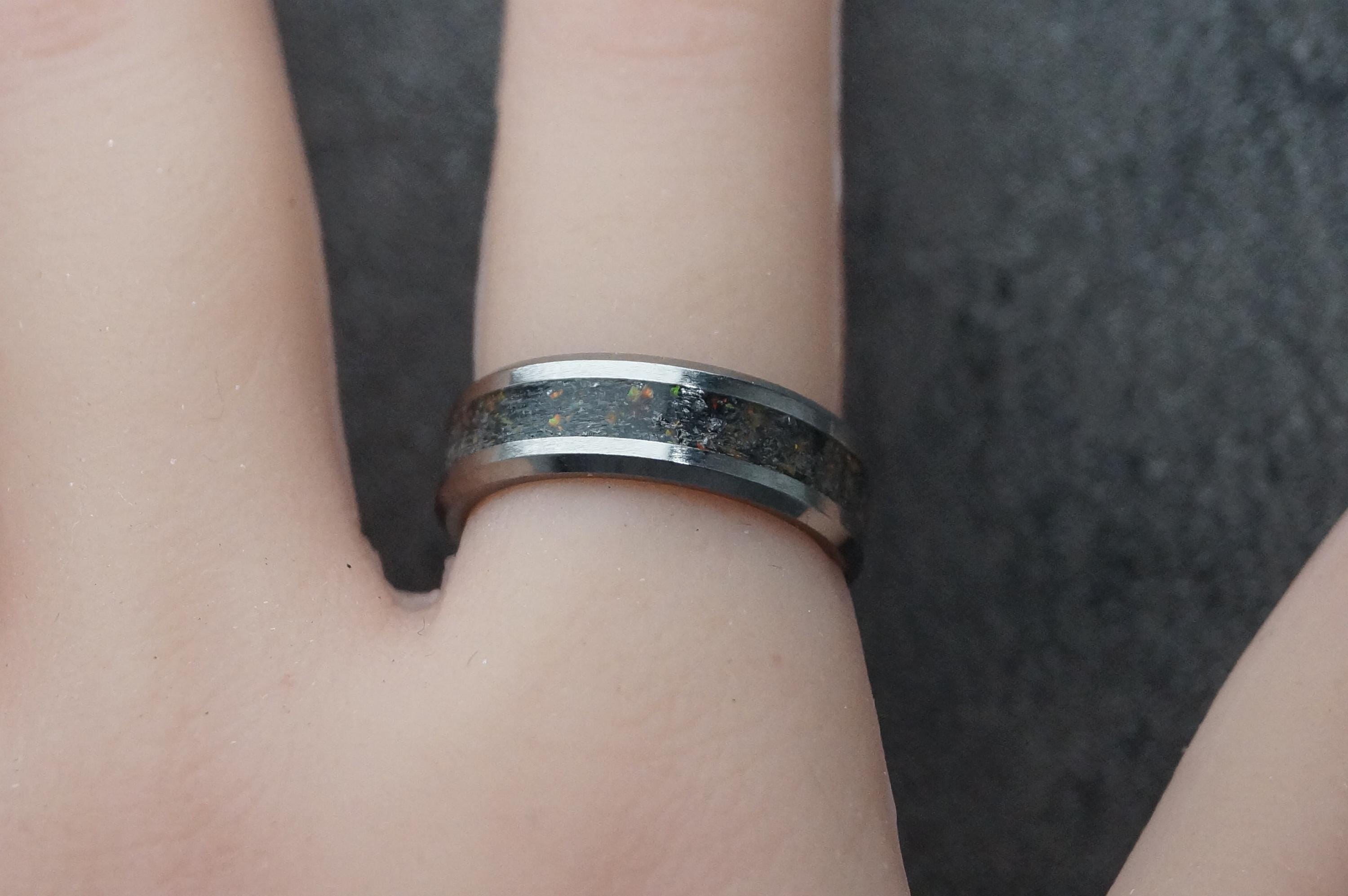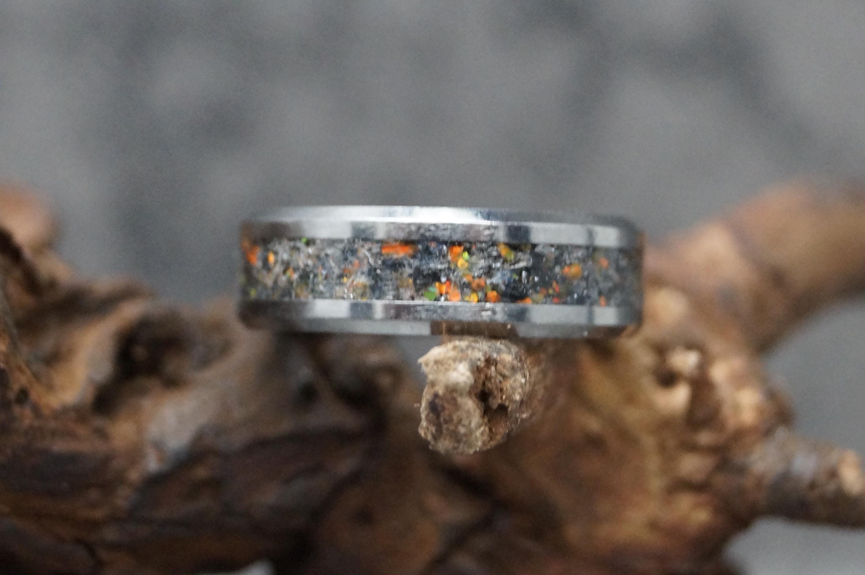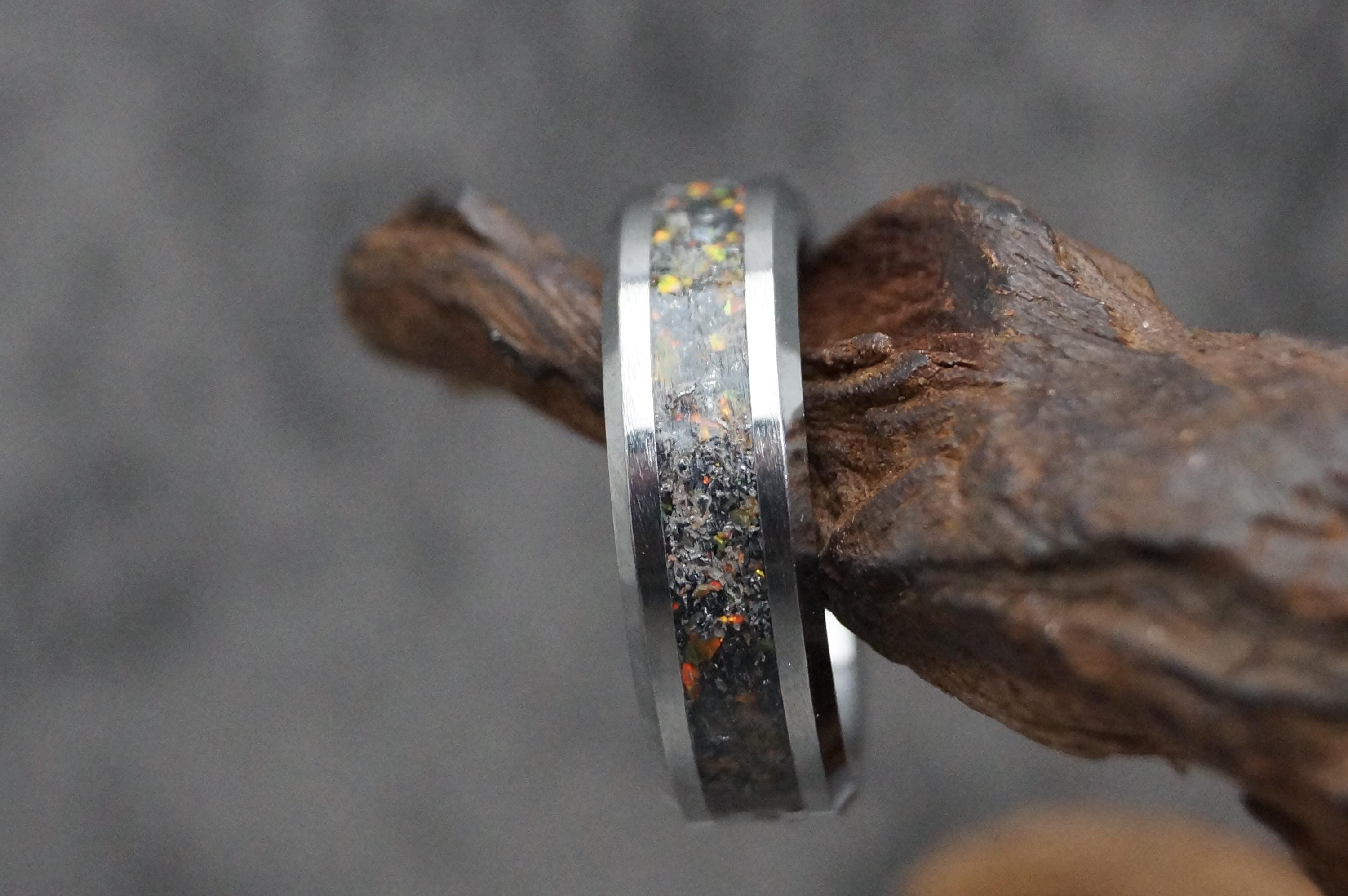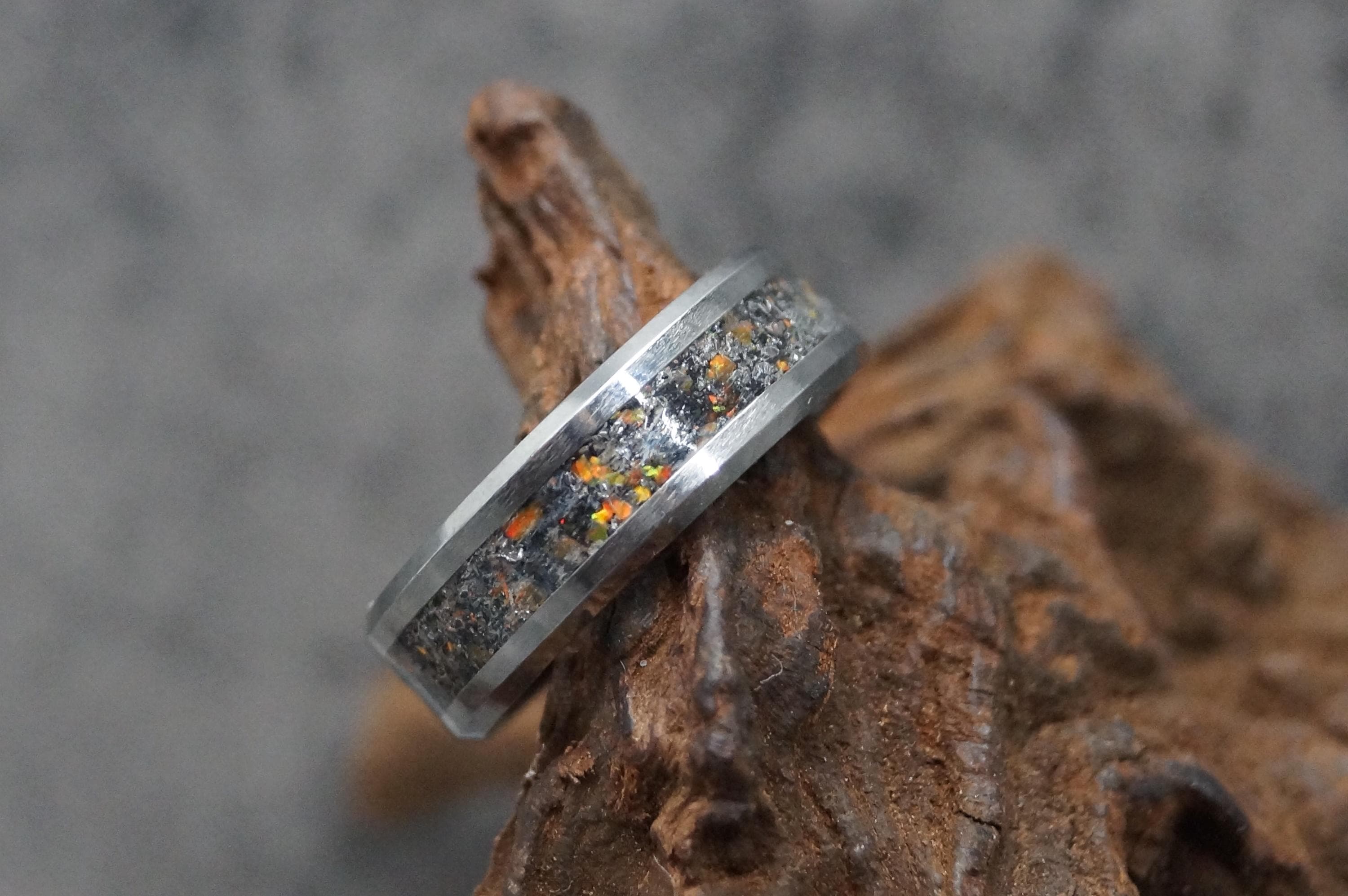 Fire Opal & Natural Peacock Ore Inlay Tungsten Carbide Ring available 4 mm, 6 mm or 8 mm wide ring - Tungsten Inlaid with Fire Opal & Natural Peacock Ore. 4 mm, 6 mm or 8 mm wide Tungsten Ring - Every ring is a unique ring