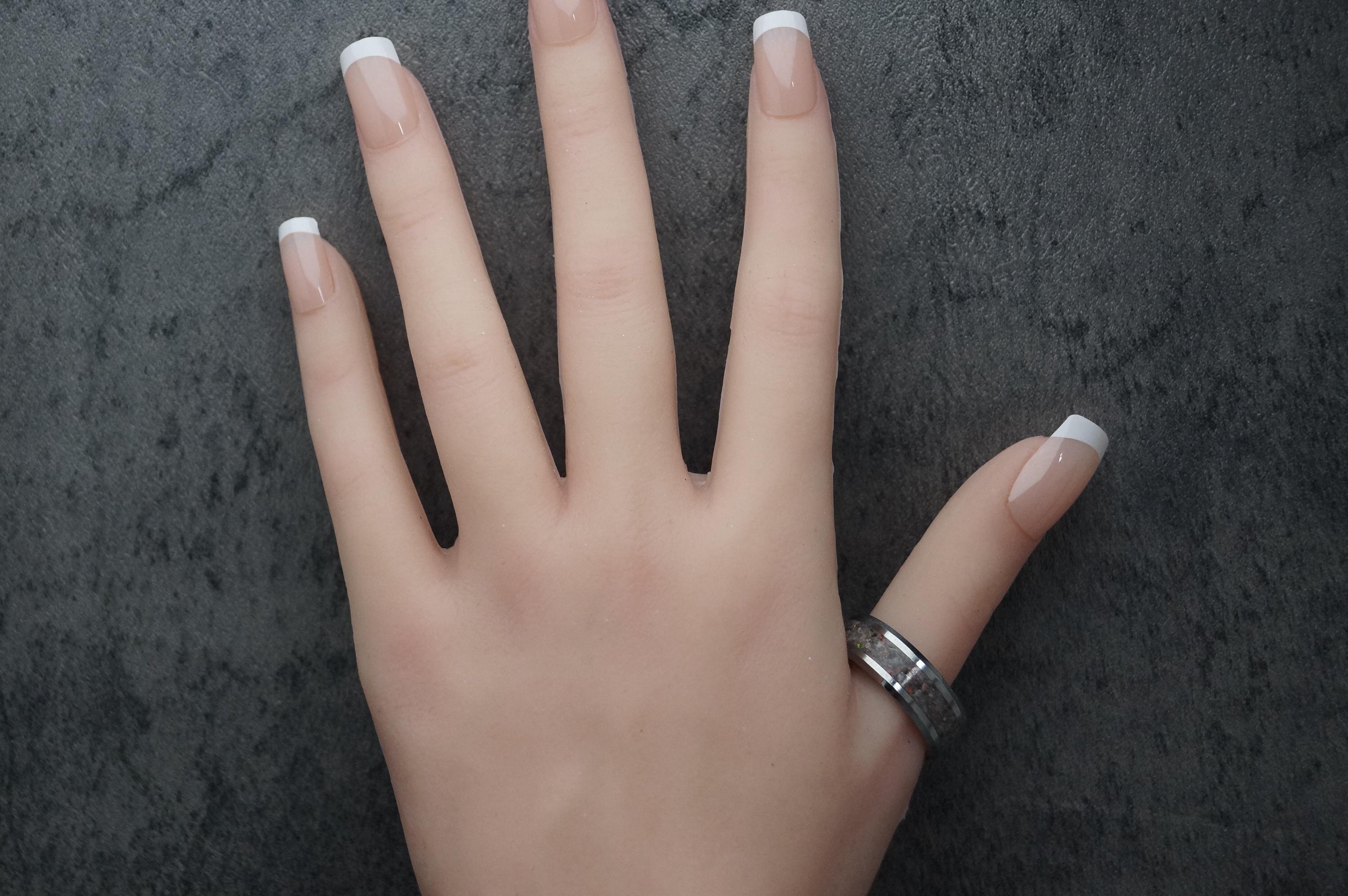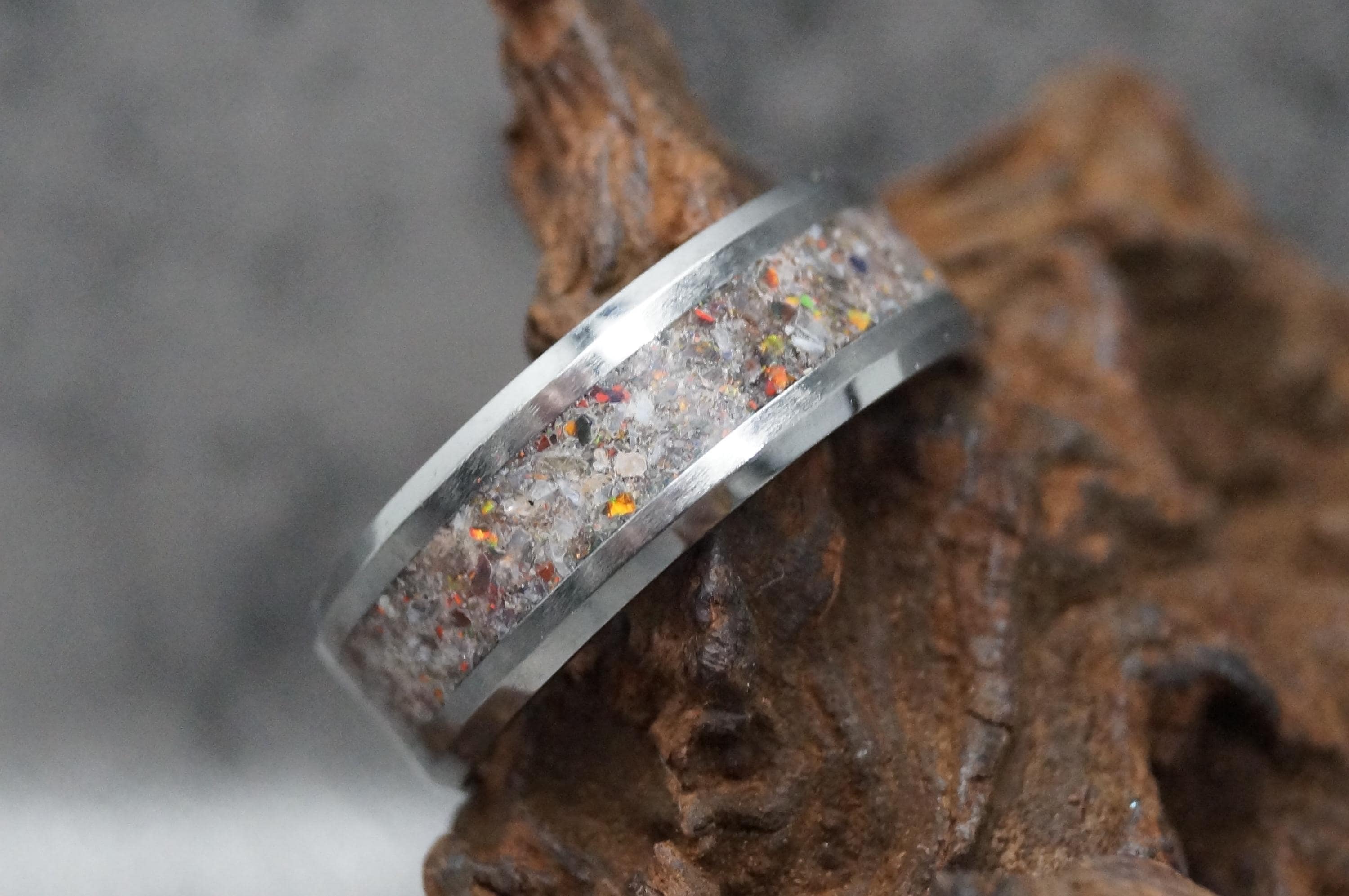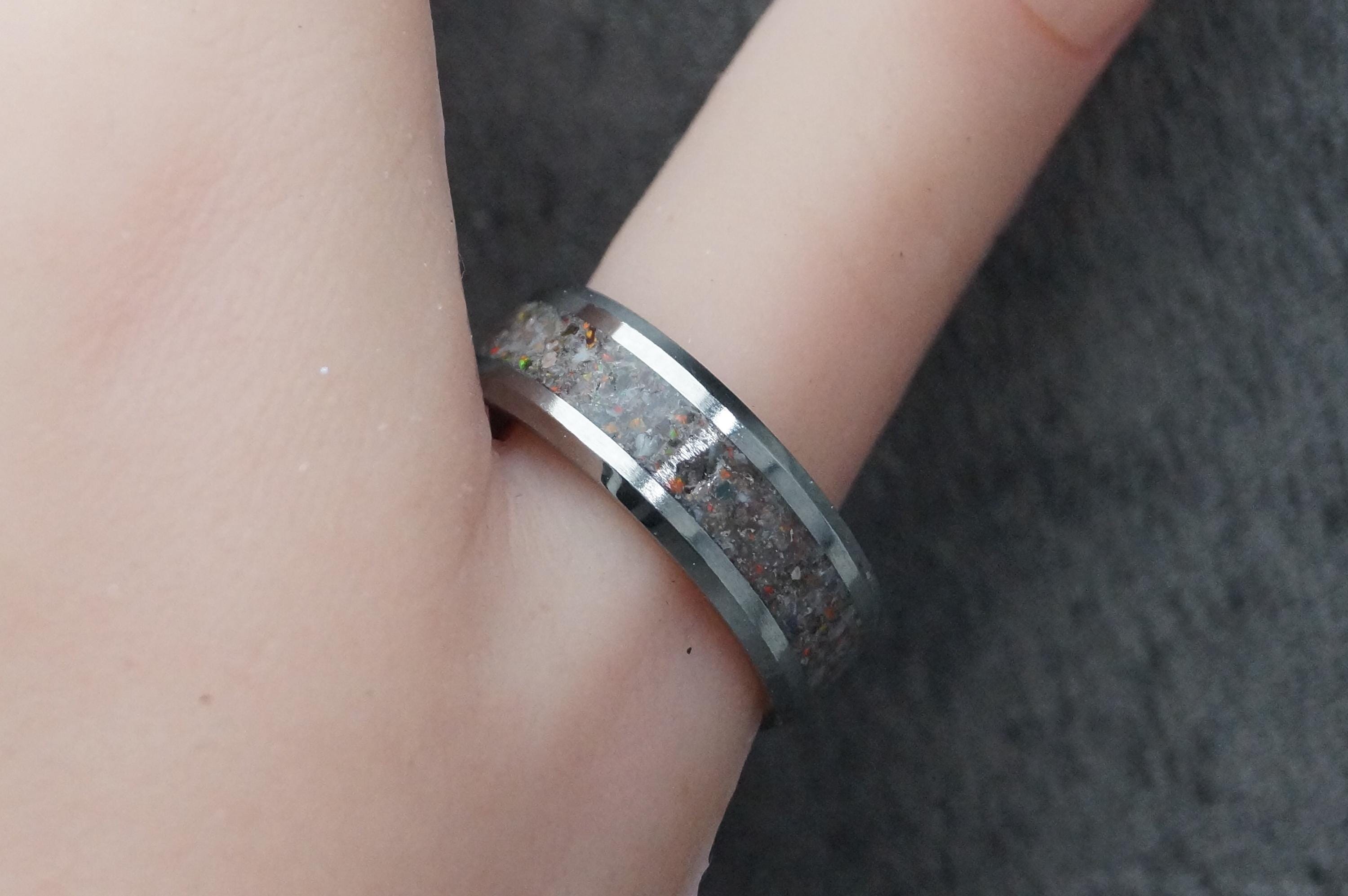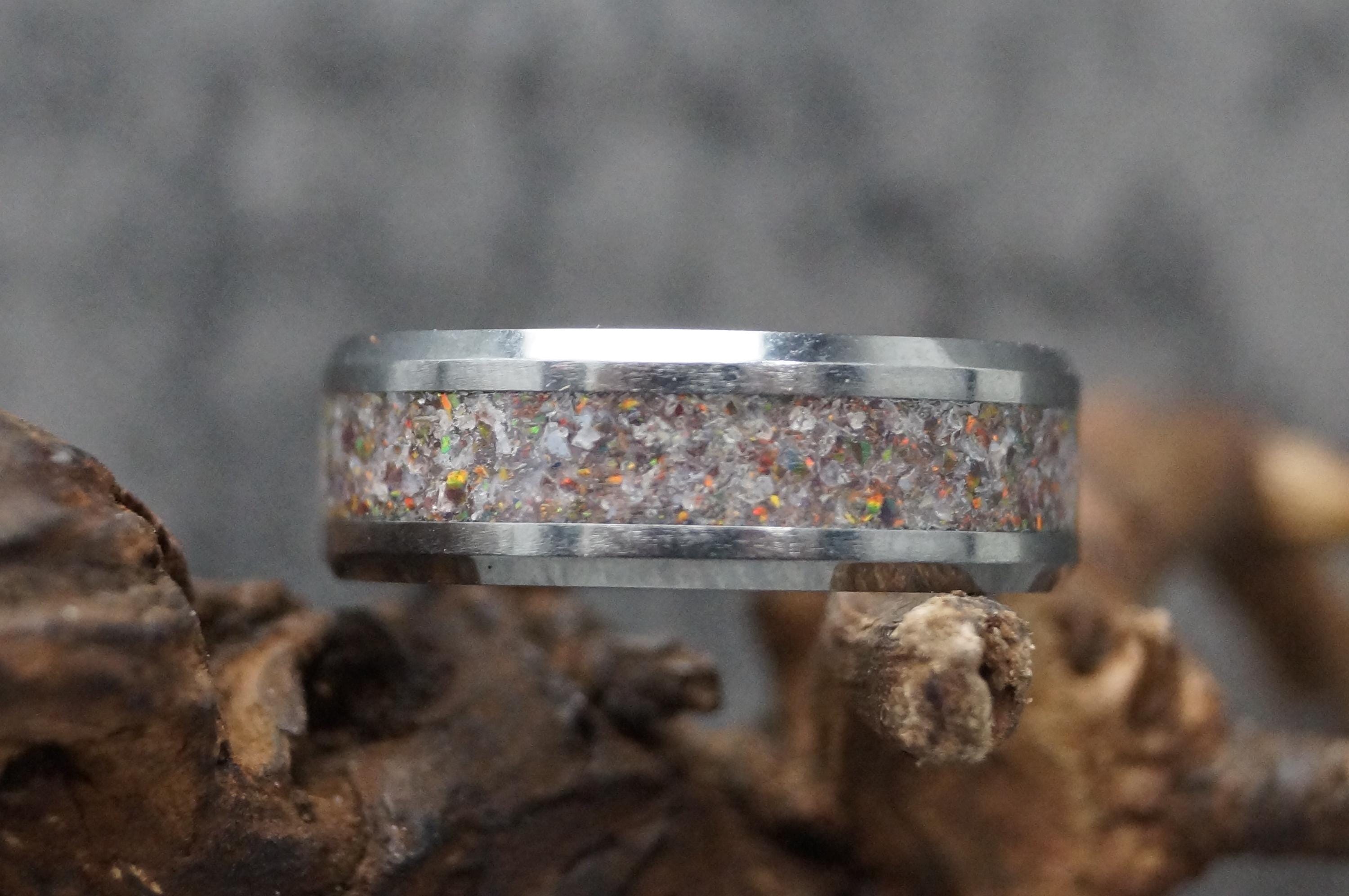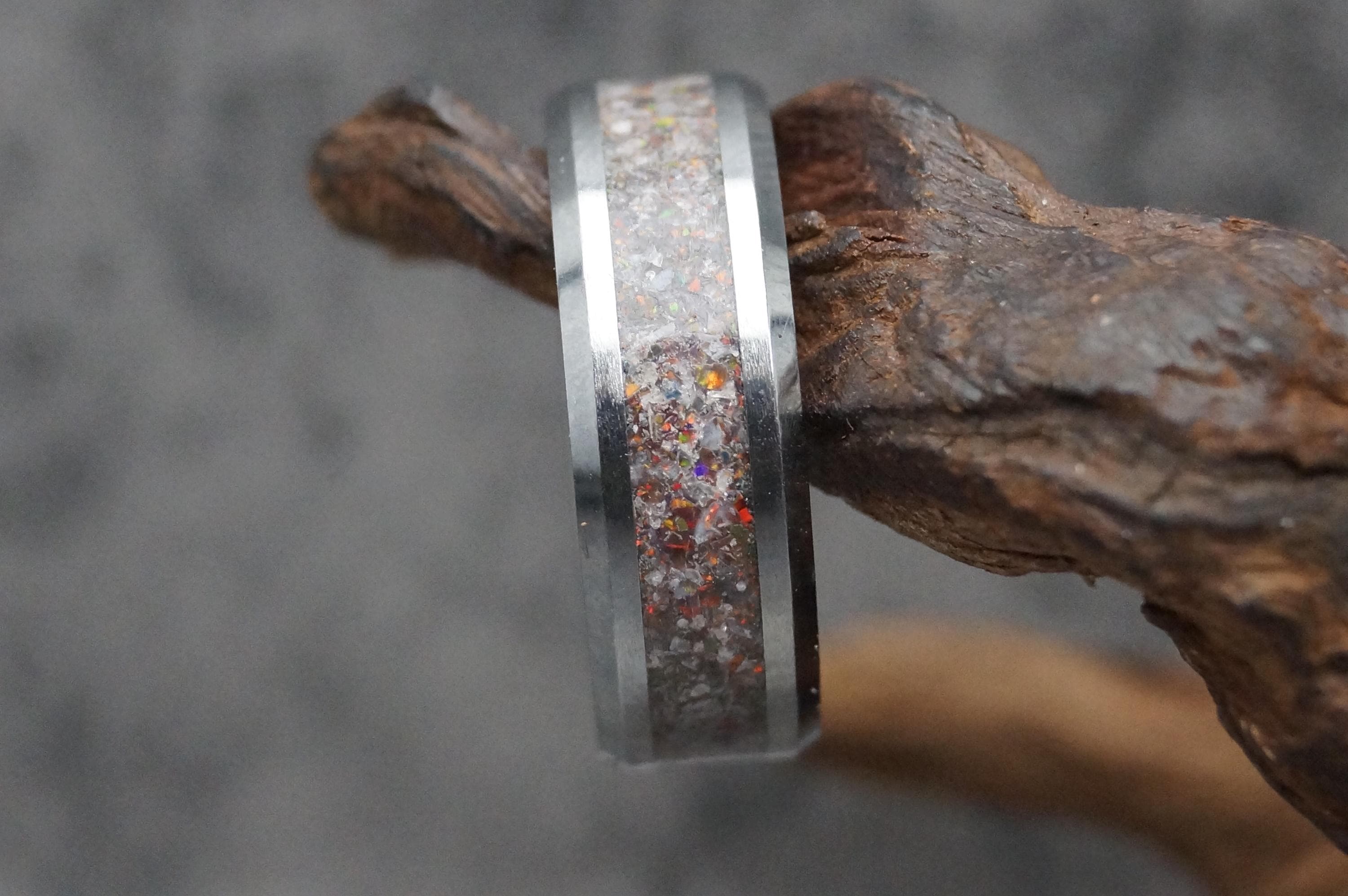 This genuine Tungsten Carbide ring inlaid with 100% Natural Madagascar White Opal.
